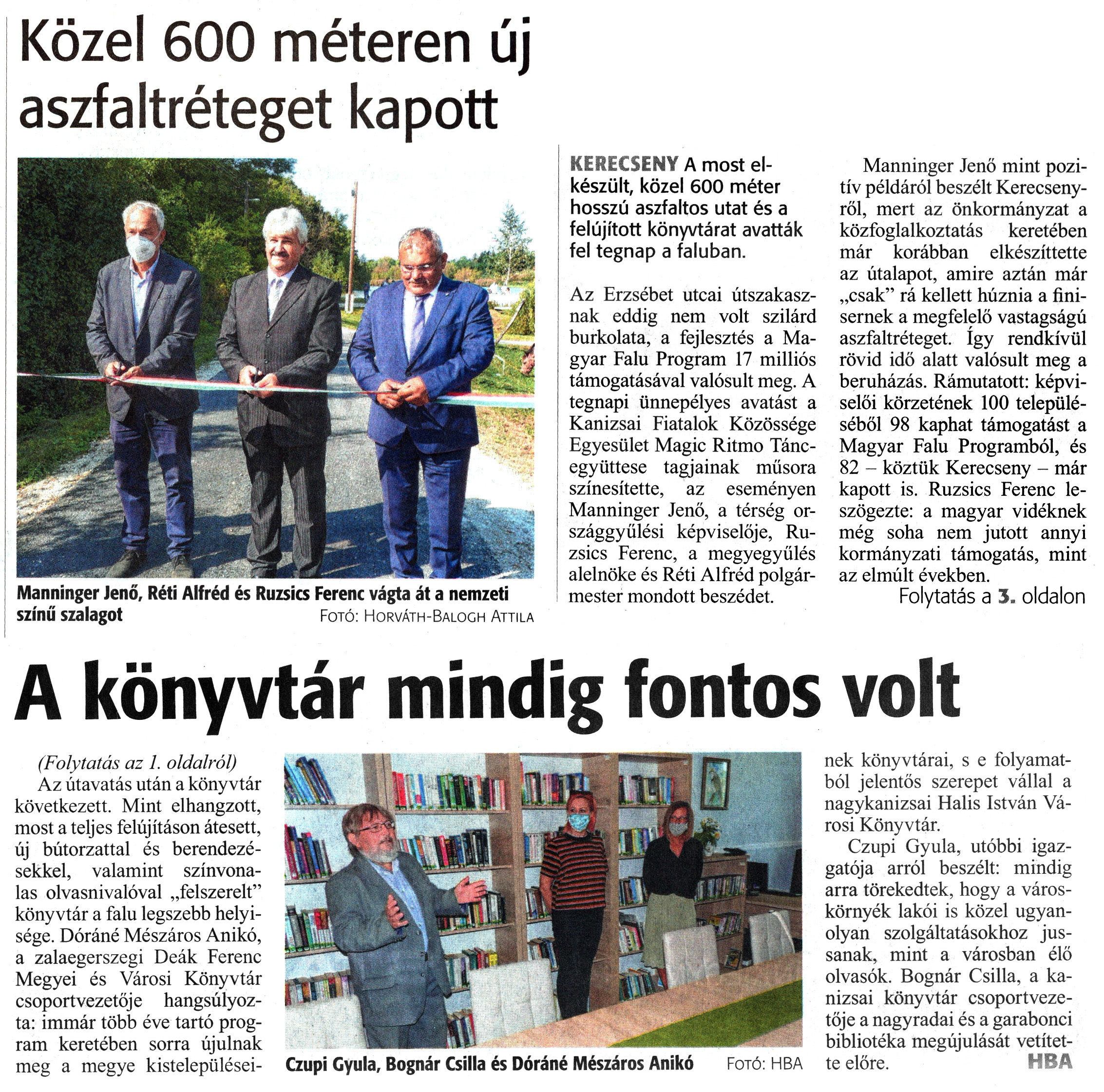 Nyilvános 1444 | 2011 | Zalai Hírlap 2020. szeptember 19. 220. szám 1, 3. oldal | Közel 600 méteren új aszfaltréteget kapott KERECSENY A most elkészült, közel 600 méter hosszú aszfaltos utat és a felújított könyvtárat avatták fel tegnap a faluban. Az Erzsébet utcai útszakasznak eddig nem volt szilárd burkolata, a fejlesztés a Magyar Falu Program 17 milliós támogatásával valósult meg. A tegnapi ünnepélyes avatást a Kanizsai Fiatalok Közössége Egyesület Magic Ritmo Táncegyüttese tagjainak műsora színesítette, az eseményen Manninger Jenő, a térség országgyűlési képviselője, Ruzsics Ferenc, a megyegyülés alelnöke és Réti Alfréd polgármester mondott beszédet. Manninger Jenő mint pozitív példáról beszélt Kerecsenyről, mert az önkormányzat a közfoglalkoztatás keretében már korábban elkészíttette az útalapot, amire aztán már „csak" rá kellett húznia a finisernek a megfelelő vastagságú aszfaltréteget. így rendkívül rövid idő alatt valósult meg a beruházás. Rámutatott: képviselői körzetének 100 településéből 98 kaphat támogatást a Magyar Falu Programból, és 82 - köztük Kerecseny - már kapott is. Ruzsics Ferenc leszögezte: a magyar vidéknek még soha nem jutott annyi kormányzati támogatás, mint az elmúlt években. Folytatás a 3. oldalon A könyvtár mindig fontos volt (Folytatás az 1. oldalról) Az útavatás után a könyvtár következett. Mint elhangzott, most a teljes felújításon átesett, új bútorzattal és berendezésekkel, valamint színvonalas olvasnivalóval „felszerelt" könyvtár a falu legszebb helyisége. Dóráné Mészáros Anikó, a zalaegerszegi Deák Ferenc Megyei és Városi Könyvtár csoportvezetője hangsúlyozta: immár több éve tartó program keretében sorra újulnak meg a megye kistelepüléseinek könyvtárai, s e folyamatból jelentős szerepet vállal a nagykanizsai Halis István Városi Könyvtár. Czupi Gyula, utóbbi igazgatója arról beszélt: mindig arra törekedtek, hogy a városkörnyék lakói is közel ugyanolyan szolgáltatásokhoz jussanak, mint a városban élő olvasók. Bognár Csilla, a kanizsai könyvtár csoportvezetője a nagyradai és a garabonci bibliotéka megújulását vetítette előre. HBA Manninger Jenő, Réti Alfréd és Ruzsics Ferenc vágta át a nemzeti színű szalagot Fotó: Horváth-Balogh Attila Czupi Gyula, Bognár Csilla és Dóráné Mészáros Anikó Fotó: HBA |