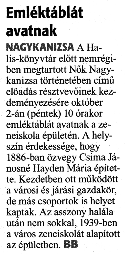 Nyilvános 1451 | 2015 | Zalai Hírlap 2020. szeptember 30. 229. szám 3. oldal | Emléktáblát avatnak NAGYKANIZSA A Halis-könyvtár előtt nemrégiben megtartott Nők Nagykanizsa történetében című előadás résztvevőinek kezdeményezésére október 2-án (péntek) 10 órakor emléktáblát avatnak a zeneiskola épületén. A helyszín érdekessége, hogy 1886-ban özvegy Csima Jánosné Hayden Mária építette. Kezdetben ott működött a városi és járási gazdakör, de más csoportok is helyet kaptak. Az asszony halála után nem sokkal, 1939-ben a város zeneiskolát alapított az épületben. BB |