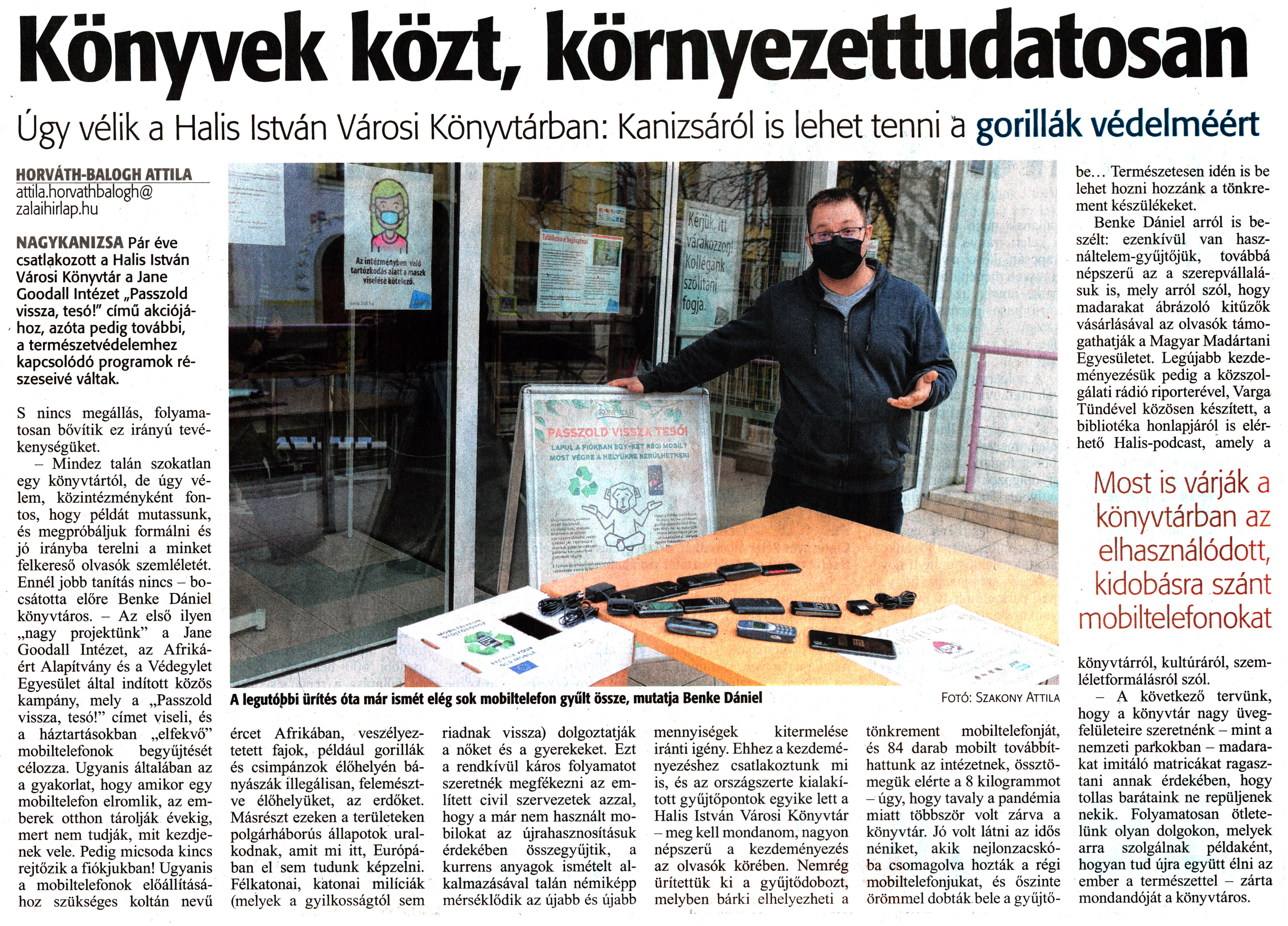 Nyilvános 1364 | 1847 | Zalai Hírlap 2021. február 8. 32. szám 4. oldal | Könyvek közt, környezettudatosan NAGYKANIZSA Pár éve csatlakozott a Halis István Városi Könyvtár a Jane Goodall Intézet „Passzold vissza, tesó!" című akciójához, azóta pedig további, a természetvédelemhez kapcsolódó programok részeseivé váltak. S nincs megállás, folyamatosan bővítik ez irányú tevékenységüket. - Mindez talán szokatlan egy könyvtártól, de úgy vélem, közintézményként fontos, hogy példát mutassunk, és megpróbáljuk formálni és jó irányba terelni a minket felkereső olvasók szemléletét. Ennél jobb tanítás nincs - bocsátotta előre Benke Dániel könyvtáros. - Az első ilyen „nagy projektünk" a Jane Goodall Intézet, az Afrikáért Alapítvány és a Védegylet Egyesület által indított közös kampány, mely a „Passzold vissza, tesó!" címet viseli, és a háztartásokban „elfekvő" mobiltelefonok begyűjtését célozza. Ugyanis általában az a gyakorlat, hogy amikor egy mobiltelefon elromlik, az emberek otthon tárolják évekig, mert nem tudják, mit kezdjenek vele. Pedig micsoda kincs rejtőzik a fiókjukban! Ugyanis a mobiltelefonok előállításához szükséges koltán nevű ércet Afrikában, veszélyeztetett fajok, például gorillák és csimpánzok élőhelyén bányásszák illegálisan, felemésztve élőhelyüket, az erdőket. Másrészt ezeken a területeken polgárháborús állapotok uralkodnak, amit mi itt, Európában el sem tudunk képzelni. Félkatonai, katonai milíciák (melyek a gyilkosságtól sem riadnak vissza) dolgoztatják a nőket és a gyerekeket. Ezt a rendkívül káros folyamatot szeretnék megfékezni az említett civil szervezetek azzal, hogy a már nem használt mobilokat az újrahasznosításuk érdekében összegyűjtik, a kurrens anyagok ismételt alkalmazásával talán némiképp mérséklődik az újabb és újabb mennyiségek kitermelése iránti igény. Ehhez a kezdeményezéshez csatlakoztunk mi is, és az országszerte kialakított gyűjtőpontok egyike lett a Halis István Városi Könyvtár - meg kell mondanom, nagyon népszerű a kezdeményezés az olvasók körében. Nemrég ürítettük ki a gyüjtődobozt, melyben bárki elhelyezheti a tönkrement mobiltelefonját, és 84 darab mobilt továbbíthattunk az intézetnek, össztömegük elérte a 8 kilogrammot - úgy, hogy tavaly a pandémia miatt többször volt zárva a könyvtár. Jó volt látni az idős néniket, akik nejlonzacskóba csomagolva hozták a régi mobiltelefonjukat, és őszinte örömmel dobták bele a gyűjtőbe... Természetesen idén is be lehet hozni hozzánk a tönkrement készülékeket. Benke Dániel arról is beszélt: ezenkívül van használtelem-gyüjtőjük, továbbá népszerű az a szerepvállalásuk is, mely arról szól, hogy madarakat ábrázoló kitűzők vásárlásával az olvasók támogathatják a Magyar Madártani Egyesületet. Legújabb kezdeményezésük pedig a közszolgálati rádió riporterével, Varga Tündével közösen készített, a bibliotéka honlapjáról is elérhető Halis-podcast, amely a könyvtárról, kultúráról, szemléletformálásról szól. - A következő tervünk, hogy a könyvtár nagy üvegfelületeire szeretnénk - mint a nemzeti parkokban - madarakat imitáló matricákat ragasztani annak érdekében, hogy tollas barátaink ne repüljenek nekik. Folyamatosan ötletelünk olyan dolgokon, melyek arra szolgálnak példaként, hogyan tud újra együtt élni az ember a természettel - zárta mondandóját a könyvtáros. HORVÁTH-BALOGH ATTILA attila.horvathbalogh@ zalaihirlap.hu |