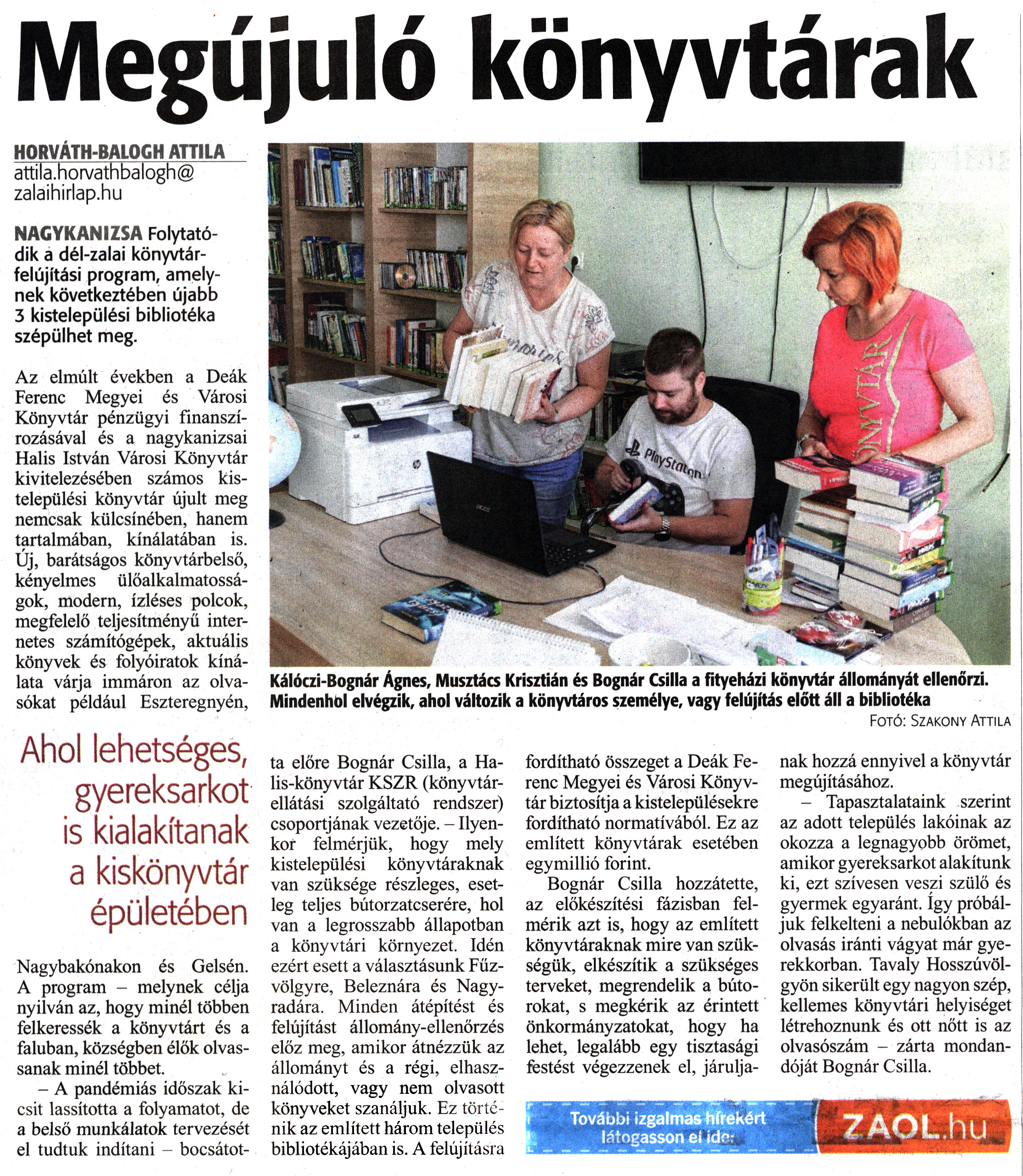 Nyilvános 1350 | 1812 | Zalai Hírlap 2021. július 1. 150. szám 4. oldal | Megújuló könyvtárak HORVÁTH-BALOGH ATTILA attila.horvathbalogh@ zalaihirlap.hu NAGYKANIZSA Folytatódik a dél-zalai könyvtárfelújítási program, amelynek következtében újabb 3 kistelepülési bibliotéka szépülhet meg. Az elmúlt években a Deák Ferenc Megyei és Városi Könyvtár pénzügyi finanszírozásával és a nagykanizsai Halis István Városi Könyvtár kivitelezésében számos kistelepülési könyvtár újult meg nemcsak külcsínében, hanem tartalmában, kínálatában is. Új, barátságos könyvtárbelső, kényelmes ülőalkalmatosságok, modern, ízléses polcok, megfelelő teljesítményű internetes számítógépek, aktuális könyvek és folyóiratok kínálata várja immáron az olvasókat például Eszteregnyén, Nagybakónakon és Gelsén. A program - melynek célja nyilván az, hogy minél többen felkeressék a könyvtárt és a faluban, községben élők olvassanak minél többet. - A pandémiás időszak kicsit lassította a folyamatot, de a belső munkálatok tervezését el tudtuk indítani - bocsátotta előre Bognár Csilla, a Halis-könyvtár KSZR (könyvtárellátási szolgáltató rendszer) csoportjának vezetője. - Ilyenkor felmérjük, hogy mely kistelepülési könyvtáraknak van szüksége részleges, esetleg teljes bútorzatcserére, hol van a legrosszabb állapotban a könyvtári környezet. Idén ezért esett a választásunk Fűzvölgyre, Beleznára és Nagyradára. Minden átépítést és felújítást állomány-ellenőrzés előz meg, amikor átnézzük az állományt és a régi, elhasználódott, vagy nem olvasott könyveket szanáljuk. Ez történik az említett három település bibliotékájában is. A felújításra fordítható összeget a Deák Ferenc Megyei és Városi Könyvtár biztosítja a kistelepülésekre fordítható normatívából. Ez az említett könyvtárak esetében egymillió forint. Bognár Csilla hozzátette, az előkészítési fázisban felmérik azt is, hogy az említett könyvtáraknak mire van szükségük, elkészítik a szükséges terveket, megrendelik a bútorokat, s megkérik az érintett önkormányzatokat, hogy ha lehet, legalább egy tisztasági festést végezzenek el, járuljanak hozzá ennyivel a könyvtár megújításához. - Tapasztalataink szerint az adott település lakóinak az okozza a legnagyobb örömet, amikor gyereksarkot alakítunk ki, ezt szívesen veszi szülő és gyermek egyaránt. így próbáljuk felkelteni a nebulókban az olvasás iránti vágyat már gyerekkorban. Tavaly Hosszúvölgyön sikerült egy nagyon szép, kellemes könyvtári helyiséget létrehoznunk és ott nőtt is az olvasószám - zárta mondandóját Bognár Csilla. Kálóczi-Bognár Ágnes, Musztács Krisztián és Bognár Csilla a fityeházi könyvtár állományát ellenőrzi. Mindenhol elvégzik, ahol változik a könyvtáros személye, vagy felújítás előtt áll a bibliotéka Fotó: Szakony Attila |