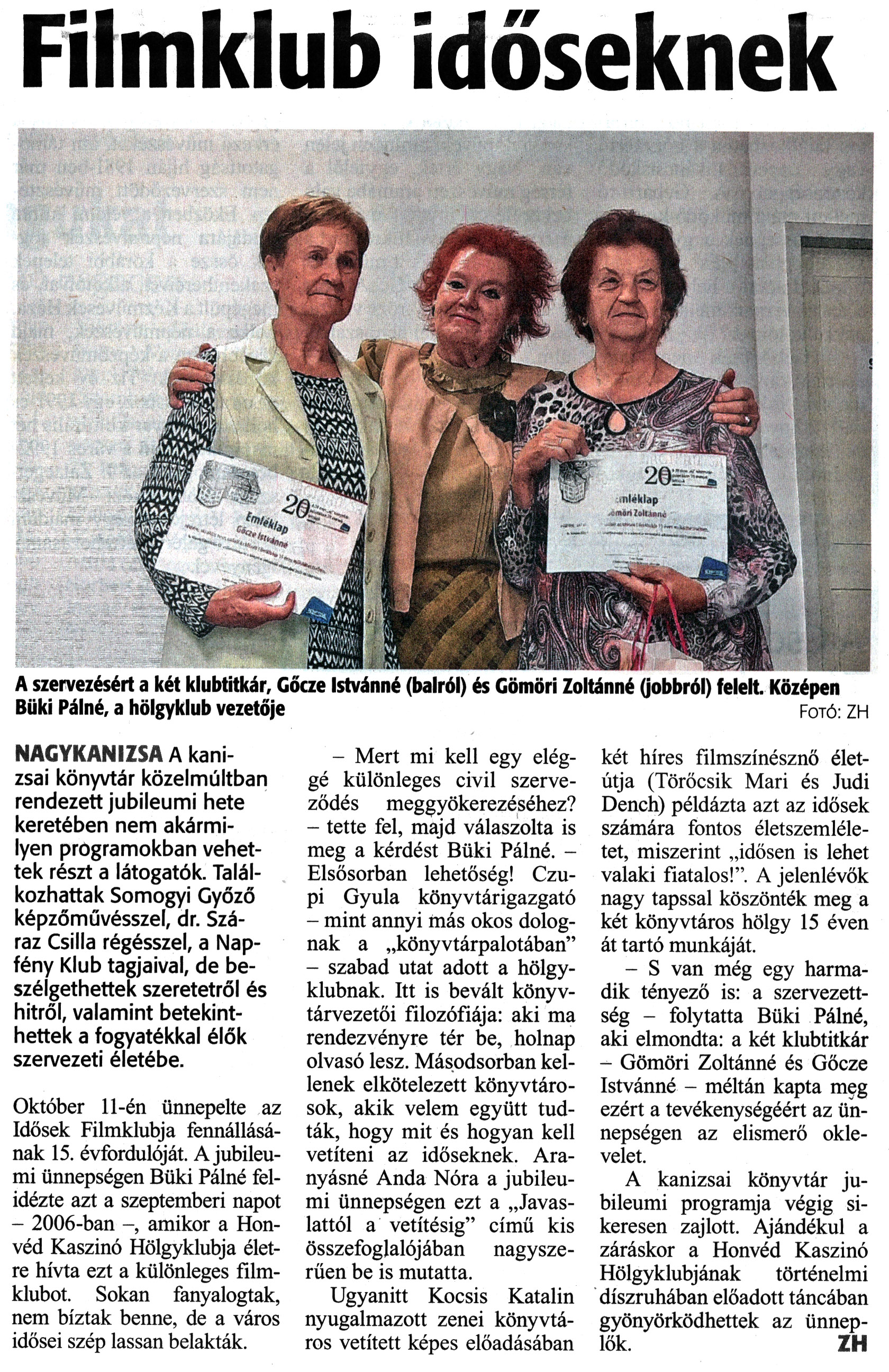 Nyilvános 1253 | 1762 | Zalai Hírlap 2021. október 15. 240. szám 12. oldal | Filmklub időseknek A szervezésért a két klubtitkár, Gőcze Istvánné (balról) és Gömöri Zoltánné (jobbról) felelt. Középen Büki Pálné, a hölgyklub vezetője Fotó: ZH NAGYKANIZSA A kanizsai könyvtár közelmúltban rendezett jubileumi hete keretében nem akármilyen programokban vehettek részt a látogatók. Találkozhattak Somogyi Győző képzőművésszel, dr. Száraz Csilla régésszel, a Napfény Klub tagjaival, de beszélgethettek szeretetről és hitről, valamint betekinthettek a fogyatékkal élők szervezeti életébe. Október 11-én ünnepelte az Idősek Filmklubja fennállásának 15. évfordulóját. A jubileumi ünnepségen Büki Pálné felidézte azt a szeptemberi napot - 2006-ban -, amikor a Honvéd Kaszinó Hölgyklubja életre hívta ezt a különleges filmklubot. Sokan fanyalogtak, nem bíztak benne, de a város idősei szép lassan belakták. - Mert mi kell egy eléggé különleges civil szerveződés meggyökerezéséhez? - tette fel, majd válaszolta is meg a kérdést Büki Pálné. - Elsősorban lehetőség! Czupi Gyula könyvtárigazgató - mint annyi más okos dolognak a „könyvtárpalotában" - szabad utat adott a hölgyklubnak. Itt is bevált könyvtárvezetői filozófiája: aki ma rendezvényre tér be, holnap olvasó lesz. Másodsorban kellenek elkötelezett könyvtárosok, akik velem együtt tudták, hogy mit és hogyan kell vetíteni az időseknek. Aranyásné Anda Nóra a jubileumi ünnepségen ezt a „Javaslattól a vetítésig" című kis összefoglalójában nagyszerűen be is mutatta. Ugyanitt Kocsis Katalin nyugalmazott zenei könyvtáros vetített képes előadásában két híres filmszínésznő életútja (Törőcsik Mari és Judi Dench) példázta azt az idősek számára fontos életszemléletet, miszerint „idősen is lehet valaki fiatalos!". A jelenlévők nagy tapssal köszönték meg a két könyvtáros hölgy 15 éven át tartó munkáját. - S van még egy harmadik tényező is: a szervezettség - folytatta Büki Pálné, aki elmondta: a két klubtitkár - Gömöri Zoltánné és Gőcze Istvánné - méltán kapta meg ezért a tevékenységéért az ünnepségen az elismerő oklevelet. A kanizsai könyvtár jubileumi programja végig sikeresen zajlott. Ajándékul a záráskor a Honvéd Kaszinó Hölgyklubjának történelmi díszruhában előadott táncában gyönyörködhettek az ünneplők. ZH |