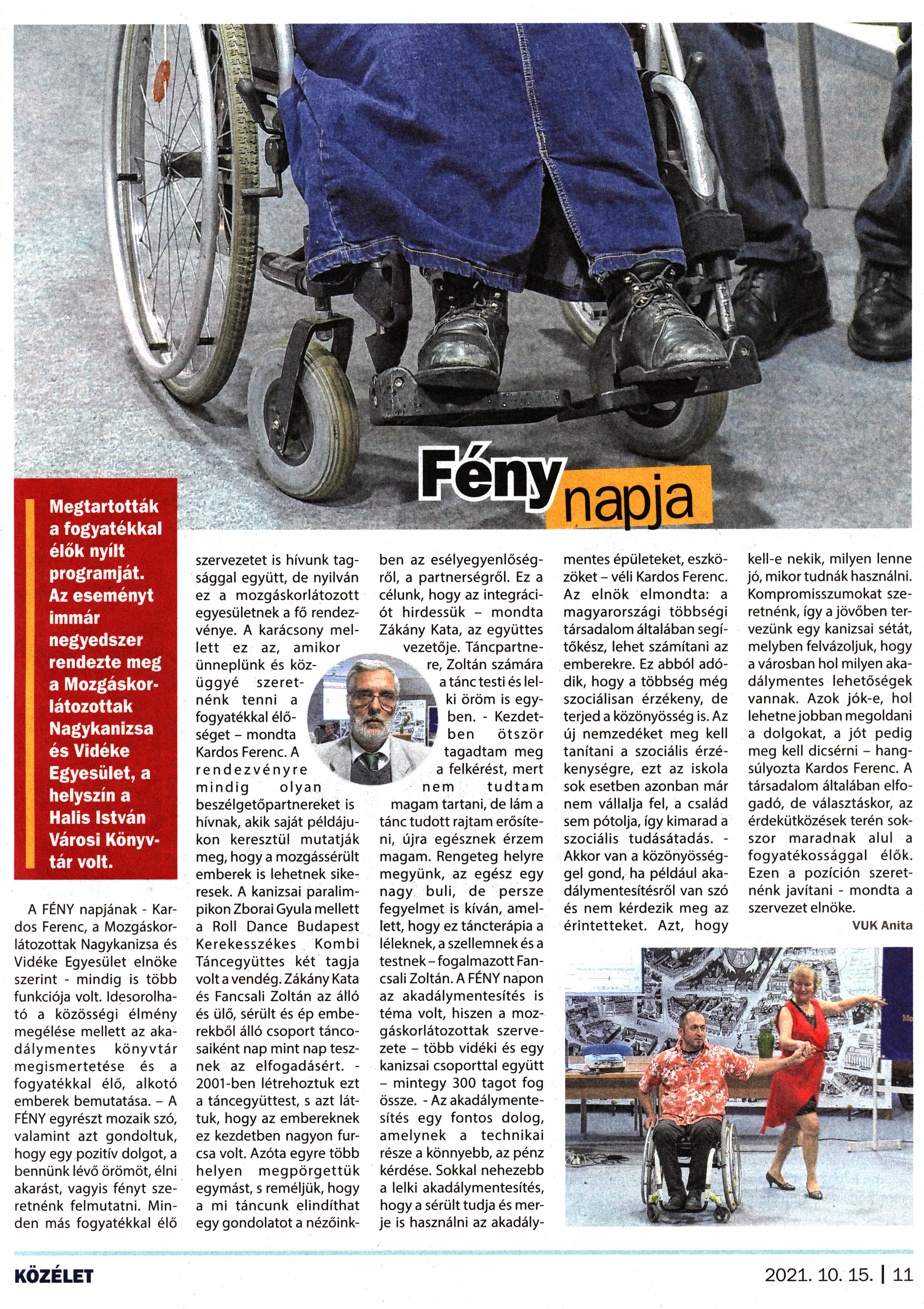 Nyilvános 1363 | 1919 | Kanizsa 2021. október 15. 18. szám 11. oldal | Fény napja Megtartották a fogyatékkal élők nyílt programját. Az eseményt immár negyedszer rendezte meg a Mozgáskorlátozottak Nagykanizsa és Vidéke Egyesület, a helyszín a Halis István Városi Könyvtár volt. A FÉNY napjának - Kardos Ferenc, a Mozgáskorlátozottak Nagykanizsa és Vidéke Egyesület elnöke szerint - mindig is több funkciója volt. Idesorolható a közösségi élmény megélése mellett az akadálymentes könyvtár megismertetése és a fogyatékkal élő, alkotó emberek bemutatása. - A FÉNY egyrészt mozaik szó, valamint azt gondoltuk, hogy egy pozitív dolgot, a bennünk lévő örömöt, élni akarást, vagyis fényt szeretnénk felmutatni. Minden más fogyatékkal élő szervezetet is hívunk tagsággal együtt, de nyilván ez a mozgáskorlátozott egyesületnek a fő rendezvénye. A karácsony mellett ez az, amikor ünneplünk és közüggyé szeretnénk tenni a fogyatékkal élőséget - mondta Kardos Ferenc. A rendezvényre mindig olyan beszélgetőpartnereket is hívnak, akik saját példájukon keresztül mutatják meg, hogy a mozgássérült emberek is lehetnek sikeresek. A kanizsai paralimpikon Zborai Gyula mellett a Roll Dance Budapest Kerekesszékes Kombi Táncegyüttes két tagja volt a vendég. Zákány Kata és Fancsali Zoltán az álló és ülő, sérült és ép emberekből álló csoport táncosaiként nap mint nap tesznek az elfogadásért. -2001-ben létrehoztuk ezt a táncegyüttest, s azt láttuk, hogy az embereknek ez kezdetben nagyon furcsa volt. Azóta egyre több helyen megpörgettük egymást, s reméljük, hogy a mi táncunk elindíthat egy gondolatot a nézőinkben az esélyegyenlőségről, a partnerségről. Ez a célunk, hogy az integrációt hirdessük - mondta Zákány Kata, az együttes vezetője. Táncpartnere, Zoltán számára a tánc testi és lelki öröm is egyben. - Kezdetben ötször tagadtam meg a felkérést, mert nem tudtam magam tartani, de lám a tánc tudott rajtam erősíteni, újra egésznek érzem magam. Rengeteg helyre megyünk, az egész egy nagy buli, de persze fegyelmet is kíván, amellett, hogy ez táncterápia a léleknek, a szellemnek és a testnek-fogalmazott Fancsali Zoltán. A FÉNY napon az akadálymentesítés is téma volt, hiszen a mozgáskorlátozottak szervezete - több vidéki és egy kanizsai csoporttal együtt - mintegy 300 tagot fog össze. - Az akadálymentesítés egy fontos dolog, amelynek a technikai része a könnyebb, az pénz kérdése. Sokkal nehezebb a lelki akadálymentesítés, hogy a sérült tudja és merje is használni az akadálymentes épületeket, eszközöket - véli Kardos Ferenc. Az elnök elmondta: a magyarországi többségi társadalom általában segítőkész, lehet számítani az emberekre. Ez abból adódik, hogy a többség még szociálisan érzékeny, de terjed a közönyösség is. Az új nemzedéket meg kell tanítani a szociális érzékenységre, ezt az iskola sok esetben azonban már nem vállalja fel, a család sem pótolja, így kimarad a szociális tudásátadás. - Akkor van a közönyösséggel gond, ha például akadálymentesítésről van szó és nem kérdezik meg az érintetteket. Azt, hogy kell-e nekik, milyen lenne jó, mikor tudnák használni. Kompromisszumokat szeretnénk, így a jövőben tervezünk egy kanizsai sétát, melyben felvázoljuk, hogy a városban hol milyen akadálymentes lehetőségek vannak. Azok jók-e, hol lehetne jobban megoldani a dolgokat, a jót pedig meg kell dicsérni - hangsúlyozta Kardos Ferenc. A társadalom általában elfogadó, de választáskor, az érdekütközések terén sokszor maradnak alul a fogyatékossággal élők. Ezen a pozíción szeretnénk javítani - mondta a szervezet elnöke. VUK Anita |