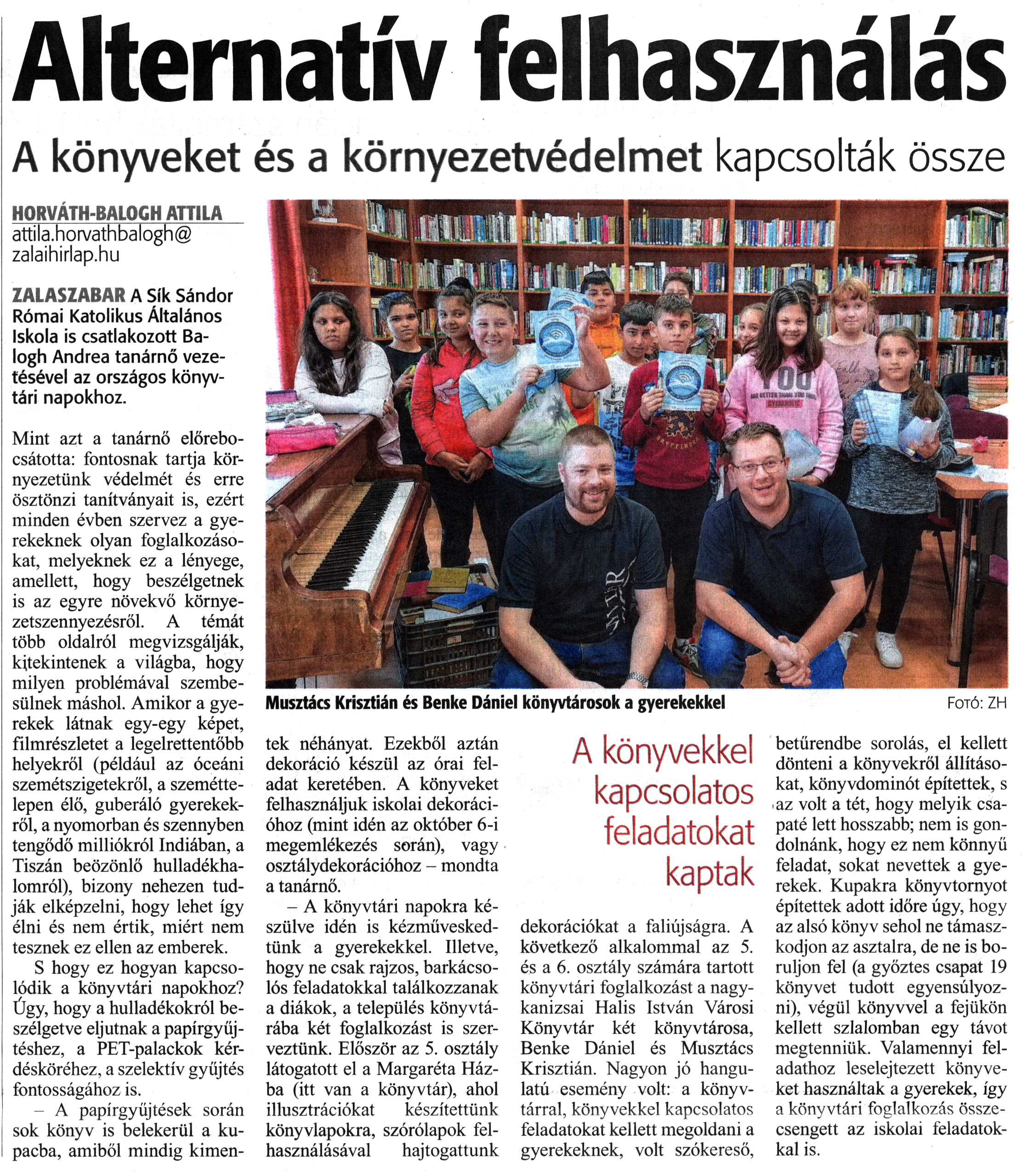 Nyilvános 1223 | 1612 | Zalai Hírlap 2021. október 21. 245. szám 4. oldal | Alternatív felhasználás A könyveket és a környezetvédelmet kapcsolták össze HORVÁTH-BALOGH ATTILA attila.horvathbalogh@ zalaihirlap.hu ZALASZABAR A Sík Sándor Római Katolikus Általános Iskola is csatlakozott Balogh Andrea tanárnő vezetésével az országos könyvtári napokhoz. Mint azt a tanárnő előrebocsátotta: fontosnak tartja környezetünk védelmét és erre ösztönzi tanítványait is, ezért minden évben szervez a gyerekeknek olyan foglalkozásokat, melyeknek ez a lényege, amellett, hogy beszélgetnek is az egyre növekvő környezetszennyezésről. A témát több oldalról megvizsgálják, kitekintenek a világba, hogy milyen problémával szembesülnek máshol. Amikor a gyerekek látnak egy-egy képet, filmrészletet a legelrettentőbb helyekről (például az óceáni szemétszigetekről, a szeméttelepen élő, guberáló gyerekekről, a nyomorban és szennyben tengődő milliókról Indiában, a Tiszán beözönlő hulladékhalomról), bizony nehezen tudják elképzelni, hogy lehet így élni és nem értik, miért nem tesznek ez ellen az emberek. S hogy ez hogyan kapcsolódik a könyvtári napokhoz? Úgy, hogy a hulladékokról beszélgetve eljutnak a papírgyűjtéshez, a PET-palackok kérdésköréhez, a szelektív gyűjtés fontosságához is. - A papírgyűjtések során sok könyv is belekerül a kupacba, amiből mindig kimentek néhányat. Ezekből aztán dekoráció készül az órai feladat keretében. A könyveket felhasználjuk iskolai dekorációhoz (mint idén az október 6-i megemlékezés során), vagy osztálydekorációhoz - mondta a tanárnő. - A könyvtári napokra készülve idén is kézműveskedtünk a gyerekekkel. Illetve, hogy ne csak rajzos, barkácsolós feladatokkal találkozzanak a diákok, a település könyvtárába két foglalkozást is szerveztünk. Először az 5. osztály látogatott el a Margaréta Házba (itt van a könyvtár), ahol illusztrációkat készítettünk könyvlapokra, szórólapok felhasználásával hajtogattunk dekorációkat a faliújságra. A következő alkalommal az 5. és a 6. osztály számára tartott könyvtári foglalkozást a nagykanizsai Halis István Városi Könyvtár két könyvtárosa, Benke Dániel és Musztács Krisztián. Nagyon jó hangulatú esemény volt: a könyvtárral, könyvekkel kapcsolatos feladatokat kellett megoldani a gyerekeknek, volt szókereső, betűrendbe sorolás, el kellett dönteni a könyvekről állításokat, könyvdominót építettek, s az volt a tét, hogy melyik csapaté lett hosszabb; nem is gondolnánk, hogy ez nem könnyű feladat, sokat nevettek a gyerekek. Kupakra könyvtornyot építettek adott időre úgy, hogy az alsó könyv sehol ne támaszkodjon az asztalra, de ne is boruljon fel (a győztes csapat 19 könyvet tudott egyensúlyozni), végül könyvvel a fejükön kellett szlalomban egy távot megtenniük. Valamennyi feladathoz leselejtezett könyveket használtak a gyerekek, így a könyvtári foglalkozás összecsengett az iskolai feladatokkal is. Musztács Krisztián és Benke Dániel könyvtárosok a gyerekekkel |