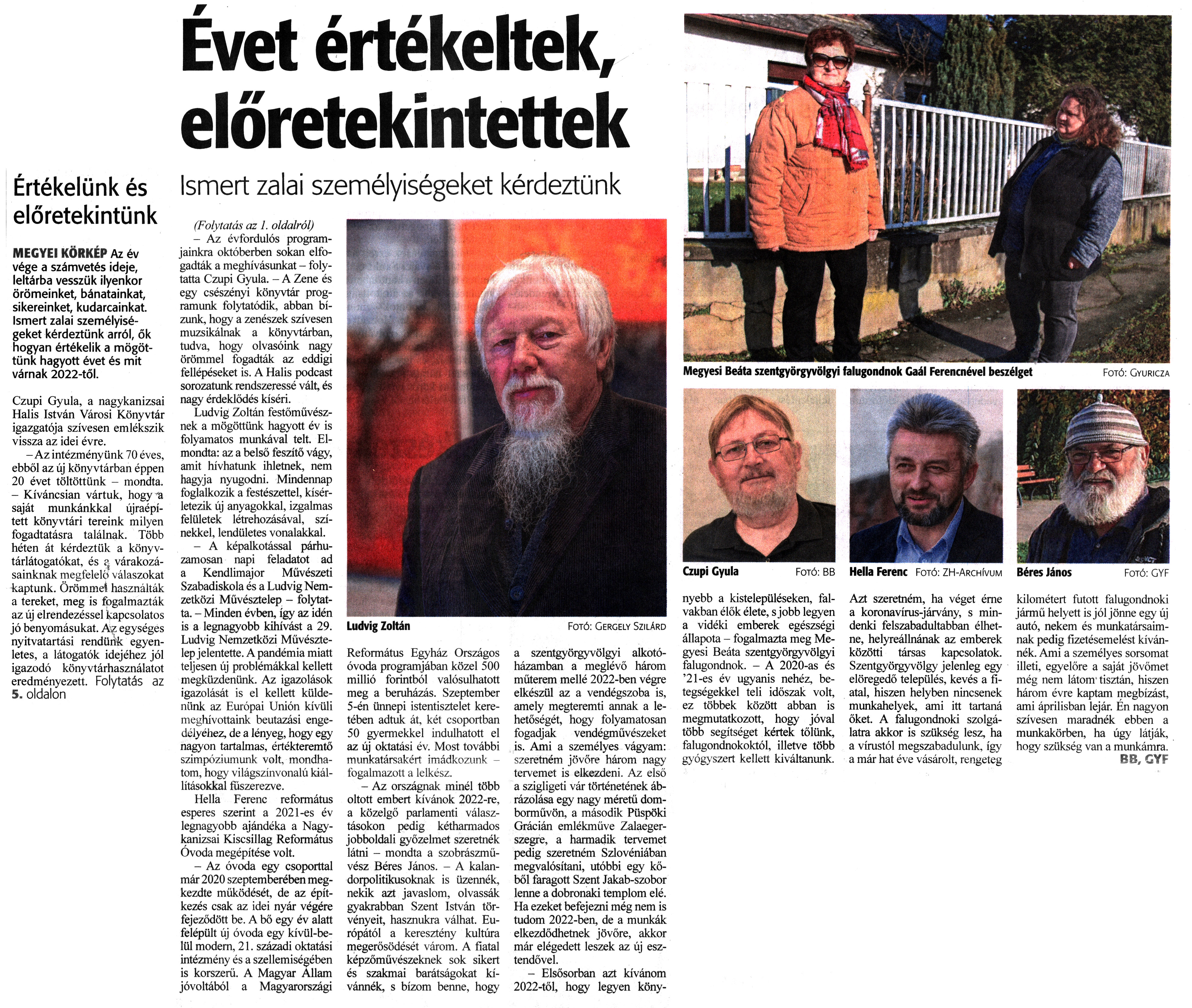 Nyilvános 1284 | 1879 | Zalai Hírlap 2021. december 31. 303. szám 1, 5. oldal | Évet értékeltek, előretekintettek Ismert zalai személyiségeket kérdeztünk Értékelünk és előretekintünk MEGYEI KÖRKÉP Az év vége a számvetés ideje, leltárba vesszük ilyenkor örömeinket, bánatainkat, sikereinket, kudarcainkat. Ismert zalai személyiségeket kérdeztünk arról, ők hogyan értékelik a mögöttünk hagyott évet és mit várnak 2022-től. Czupi Gyula, a nagykanizsai Halis István Városi Könyvtár igazgatója szívesen emlékszik vissza az idei évre. - Az intézményünk 70 éves, ebből az új könyvtárban éppen 20 évet töltöttünk - mondta. - Kíváncsian vártuk, hogy a saját munkánkkal újraépített könyvtári tereink milyen fogadtatásra találnak. Több héten át kérdeztük a könyvtárlátogatókat, és a várakozásainknak megfelelő válaszokat kaptunk. Örömmel használták a tereket, meg is fogalmazták az új elrendezéssel kapcsolatos jó benyomásukat. Az egységes nyitvatartási rendünk egyenletes, a látogatók idejéhez jól igazodó könyvtárhasználatot eredményezett. Folytatás az 5. oldalon (Folytatás az 1. oldalról) - Az évfordulós programjainkra októberben sokan elfogadták a meghívásunkat - folytatta Czupi Gyula. - A Zene és egy csészényi könyvtár programunk folytatódik, abban bízunk, hogy a zenészek szívesen muzsikálnak a könyvtárban, tudva, hogy olvasóink nagy örömmel fogadták az eddigi fellépéseket is. A Halis podcast sorozatunk rendszeressé vált, és nagy érdeklődés kíséri. Ludvig Zoltán festőművésznek a mögöttünk hagyott év is folyamatos munkával telt. Elmondta: az a belső feszítő vágy, amit hívhatunk ihletnek, nem hagyja nyugodni. Mindennap foglalkozik a festészettel, kísérletezik új anyagokkal, izgalmas felületek létrehozásával, színekkel, lendületes vonalakkal. - A képalkotással párhuzamosan napi feladatot ad a Kendlimajor Művészeti Szabadiskola és a Ludvig Nemzetközi Művésztelep - folytatta. - Minden évben, így az idén is a legnagyobb kihívást a 29. Ludvig Nemzetközi Művésztelepjelentette. A pandémia miatt teljesen új problémákkal kellett megküzdenünk. Az igazolások igazolását is el kellett küldenünk az Európai Unión kívüli meghívottaink beutazási engedélyéhez, de a lényeg, hogy egy nagyon tartalmas, értékteremtő szimpóziumunk volt, mondhatom, hogy világszínvonalú kiállításokkal fűszerezve. Hella Ferenc református esperes szerint a 202l-es év legnagyobb ajándéka a Nagykanizsai Kiscsillag Református Óvoda megépítése volt. - Az óvoda egy csoporttal már 2020 szeptemberében megkezdte működését, de az építkezés csak az idei nyár végére fejeződött be. A bő egy év alatt felépült új óvoda egy kívül-belül modern, 21. századi oktatási intézmény és a szellemiségében is korszerű. A Magyar Állam jóvoltából a Magyarországi Református Egyház Országos óvoda programjában közel 500 millió forintból valósulhatott meg a beruházás. Szeptember 5-én ünnepi istentisztelet keretében adtuk át, két csoportban 50 gyermekkel indulhatott el az új oktatási év. Most további munkatársakért imádkozunk - fogalmazott a lelkész. - Az országnak minél több oltott embert kívánok 2022-re, a közelgő parlamenti választásokon pedig kétharmados jobboldali győzelmet szeretnék látni - mondta a szobrászművész Béres János. - A kalandorpolitikusoknak is üzennék, nekik azt javaslom, olvassák gyakrabban Szent István törvényeit, hasznukra válhat. Európától a keresztény kultúra megerősödését várom. A fiatal képzőművészeknek sok sikert és szakmai barátságokat kívánnék, s bízom benne, hogy a szentgyörgyvölgyi alkotóházamban a meglévő három műterem mellé 2022-ben végre elkészül az a vendégszoba is, amely megteremti annak a lehetőségét, hogy folyamatosan fogadjak vendégművészeket is. Ami a személyes vágyam: szeretném jövőre három nagy tervemet is elkezdeni. Az első a szigligeti vár történetének ábrázolása egy nagy méretű domborművön, a második Püspöki Grácián emlékműve Zalaegerszegre, a harmadik tervemet pedig szeretném Szlovéniában megvalósítani, utóbbi egy kőből faragott Szent Jakab-szobor lenne a dobronaki templom elé. Ha ezeket befejezni még nem is tudom 2022-ben, de a munkák elkezdődhetnek jövőre, akkor már elégedett leszek az új esztendővel. - Elsősorban azt kívánom 2022-től, hogy legyen könnyebb a kistelepüléseken, falvakban élők élete, s jobb legyen a vidéki emberek egészségi állapota - fogalmazta meg Megyesi Beáta szentgyörgyvölgyi falugondnok. - A 2020-as és ''''21-es év ugyanis nehéz, betegségekkel teli időszak volt, ez többek között abban is megmutatkozott, hogy jóval több segítséget kértek tőlünk, falugondnokoktól, illetve több gyógyszert kellett kiváltanunk. Azt szeretném, ha véget érne a koronavírus-járvány, s mindenki felszabadultabban élhetne, helyreállnának az emberek közötti társas kapcsolatok. Szentgyörgyvölgy jelenleg egy elöregedő település, kevés a fiatal, hiszen helyben nincsenek munkahelyek ami itt tartaná őket. A falugondnoki szolgálatra akkor is szükség lesz, ha a vírustól megszabadulunk, így a már hat éve vásárolt, rengeteg kilométert futott falugondnoki jármű helyett is jól jönne egy új autó, nekem és munkatársaimnak pedig fizetésemelést kívánnék. Ami a személyes sorsomat illeti, egyelőre a saját jövőmet még nem látom tisztán, hiszen három évre kaptam megbízást, ami áprilisban lejár. Én nagyon szívesen maradnék ebben a munkakörben, ha úgy látják, hogy szükség van a munkámra. BB, GYF |