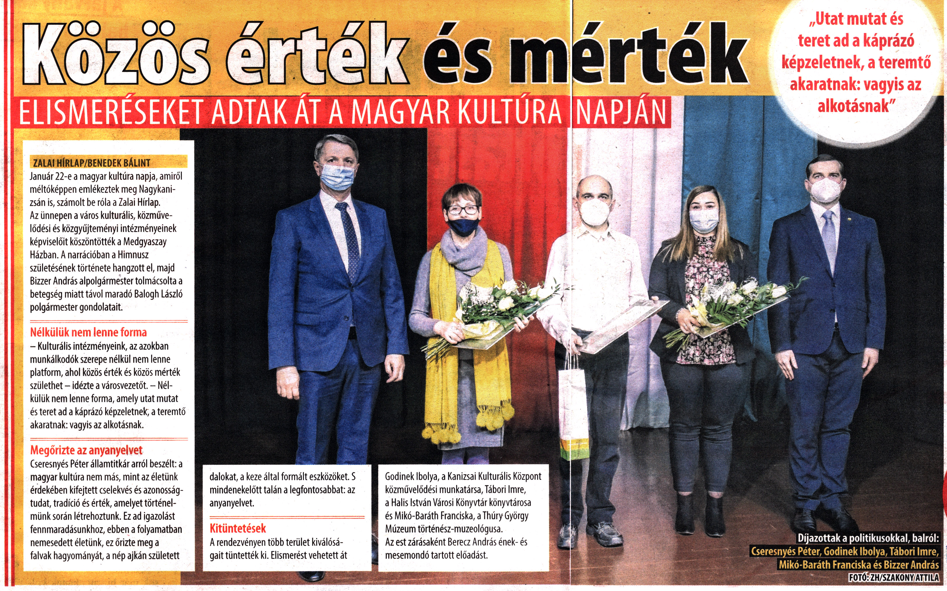Nyilvános 1720 | 2673 | City7 magazin 2022. január 28. 4. szám 6-7. oldal | Közös érték és mérték - Elismeréseket adtak át a magyar kultúra napján „Utat mutat és teret ad a káprázó képzeletnek, a teremtő akaratnak: vagyis az alkotásnak" ZALAI HÍRLAP/BENEDEK BÁLINT Január 22-e a magyar kultúra napja, amiről méltóképpen emlékeztek meg Nagykanizsán is, számolt be róla a Zalai Hírlap. Az ünnepen a város kulturális, közművelődési és közgyűjteményi intézményeinek képviselőit köszöntötték a Medgyaszay Házban. A narrációban a Himnusz születésének története hangzott el, majd Bizzer András alpolgármester tolmácsolta a betegség miatt távol maradó Balogh László polgármester gondolatait. Nélkülük nem lenne forma - Kulturális intézményeink, az azokban munkálkodók szerepe nélkül nem lenne platform, ahol közös érték és közös mérték születhet - idézte a városvezetőt. - Nélkülük nem lenne forma, amely utat mutat és teret ad a káprázó képzeletnek, a teremtő akaratnak: vagyis az alkotásnak. Megőrizte az anyanyelvet Cseresnyés Péter államtitkár arról beszélt: a magyar kultúra nem más, mint az életünk érdekében kifejtett cselekvés és azonosságtudat, tradíció és érték, amelyet történelmünk során létrehoztunk. Ez ad igazolást fennmaradásunkhoz, ebben a folyamatban nemesedett életünk, ez őrizte meg a falvak hagyományát, a nép ajkán született dalokat, a keze által formált eszközöket. S mindenekelőtt talán a legfontosabbat: az anyanyelvet. Kitüntetések A rendezvényen több terület kiválóságait tüntették ki. Elismerést vehetett át Gödinek Ibolya, a Kanizsai Kulturális Központ közművelődési munkatársa, Tábori Imre, a Halis István Városi Könyvtár könyvtárosa és Mikó-Baráth Franciska, a Thúry György Múzeum történész-muzeológusa. Az est zárásaként Berecz András ének- és mesemondó tartott előadást. Díjazottak a politikusokkal, balról: Cseresnyés Péter, Gödinek Ibolya, Tábori Imre, Mikó-Baráth Franciska és Bizzer András |