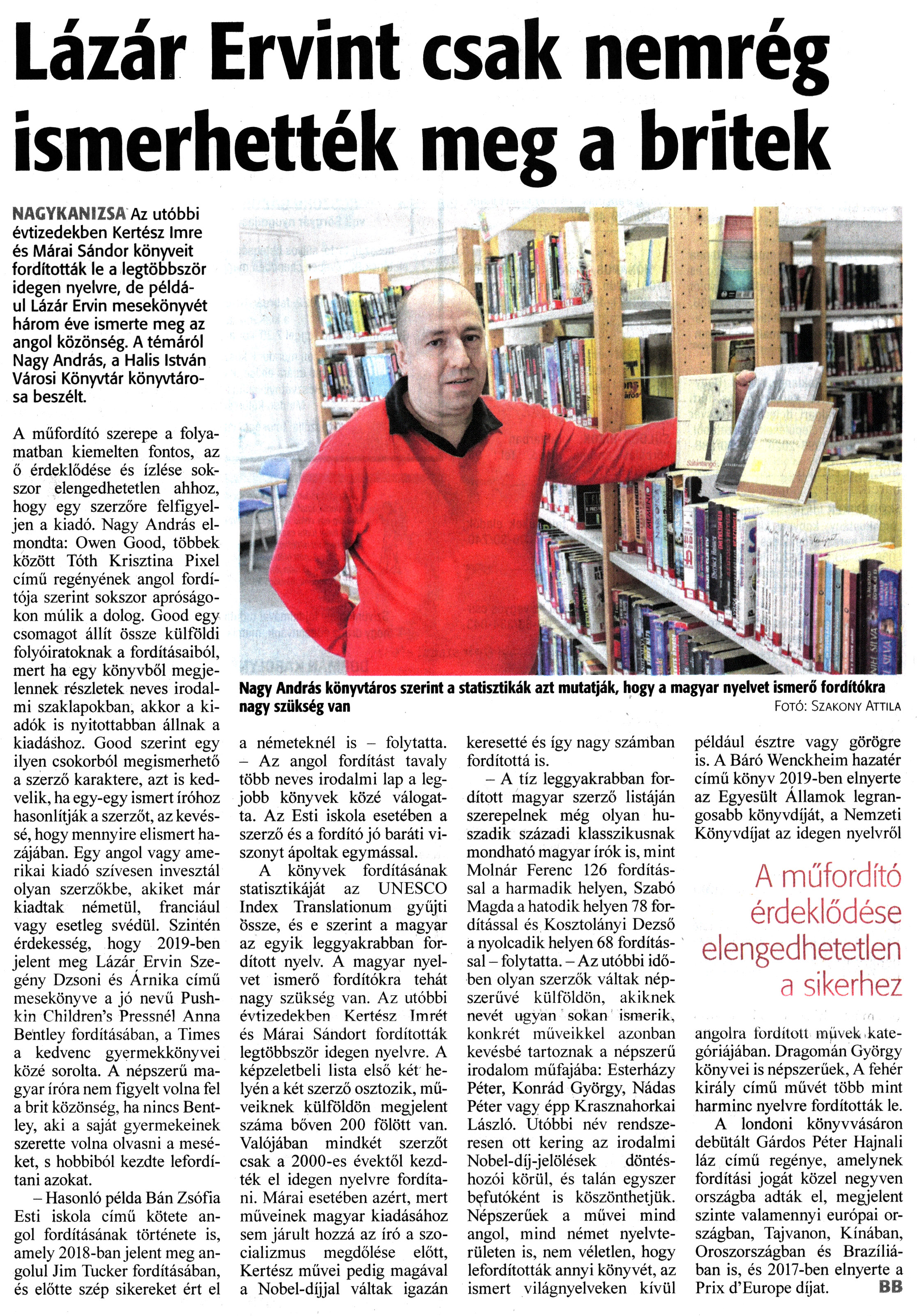 Nyilvános 1235 | 1696 | Zalai Hírlap 2022. február 9. 33. szám 12. oldal | Lázár Ervint csak nemrég ismerhették meg a britek NAGYKANIZSA Az utóbbi évtizedekben Kertész Imre és Márai Sándor könyveit fordították le a legtöbbször idegen nyelvre, de például Lázár Ervin mesekönyvét három éve ismerte meg az angol közönség. A témáról Nagy András, a Halis István Városi Könyvtár könyvtárosa beszélt. A műfordító szerepe a folyamatban kiemelten fontos, az ő érdeklődése és ízlése sokszor elengedhetetlen ahhoz, hogy egy szerzőre felfigyeljen a kiadó. Nagy András elmondta: Owen Good, többek között Tóth Krisztina Pixel című regényének angol fordítója szerint sokszor apróságokon múlik a dolog. Good egy csomagot állít össze külföldi folyóiratoknak a fordításaiból, mert ha egy könyvből megjelennek részletek neves irodalmi szaklapokban, akkor a kiadók is nyitottabban állnak a kiadáshoz. Good szerint egy ilyen csokorból megismerhető a szerző karaktere, azt is kedvelik, ha egy-egy ismert íróhoz hasonlítják a szerzőt, az kevéssé, hogy mennyire elismert hazájában. Egy angol vagy amerikai kiadó szívesen invesztál olyan szerzőkbe, akiket már kiadtak németül, franciául vagy esetleg svédül. Szintén érdekesség, hogy 2019-ben jelent meg Lázár Ervin Szegény Dzsoni és Árnika című mesekönyve a jó nevű Push-kin Children''s Pressnél Anna Bentley fordításában, a Times a kedvenc gyermekkönyvei közé sorolta. A népszerű magyar íróra nem figyelt volna fel a brit közönség, ha nincs Bentley, aki a saját gyermekeinek szerette volna olvasni a meséket, s hobbiból kezdte lefordítani azokat. - Hasonló példa Bán Zsófia Esti iskola című kötete angol fordításának története is, amely 2018-ban jelent meg angolul Jim Tucker fordításában, és előtte szép sikereket ért el a németeknél is - folytatta. - Az angol fordítást tavaly több neves irodalmi lap a legjobb könyvek közé válogatta. Az Esti iskola esetében a szerző és a fordító jó baráti viszonyt ápoltak egymással. A könyvek fordításának statisztikáját az UNESCO Index Translationum gyűjti Össze, és e szerint a magyar az egyik leggyakrabban fordított nyelv. A magyar nyelvet ismerő fordítókra tehát nagy szükség van. Az utóbbi évtizedekben Kertész Imrét és Márai Sándort fordították legtöbbször idegen nyelvre. A képzeletbeli lista első két helyén a két szerző osztozik, műveiknek külföldön megjelent száma bőven 200 fölött van. Valójában mindkét szerzőt csak a 2000-es évektől kezdték el idegen nyelvre fordítani. Márai esetében azért, mert műveinek magyar kiadásához sem járult hozzá az író a szocializmus megdőlése előtt, Kertész művei pedig magával a Nobel-díjjal váltak igazán keresetté és így nagy számban fordítottá is. - A tíz leggyakrabban fordított magyar szerző listáján szerepelnek még olyan huszadik századi klasszikusnak mondható magyar írók is, mint Molnár Ferenc 126 fordítással a harmadik helyen, Szabó Magda a hatodik helyen 78 fordítással és Kosztolányi Dezső a nyolcadik helyen 68 fordítással - folytatta. - Az utóbbi időben olyan szerzők váltak népszerűvé külföldön, akiknek nevét ugyan sokan ismerik, konkrét műveikkel azonban kevésbé tartoznak a népszerű irodalom műfajába: Esterházy Péter, Konrád György, Nádas Péter vagy épp Krasznahorkai László. Utóbbi név rendszeresen ott kering az irodalmi Nobel-díj-jelölések döntéshozói körül, és talán egyszer befutóként is köszönthetjük. Népszerűek a művei mind angol, mind német nyelvterületen is, nem véletlen, hogy lefordították annyi könyvét, az ismert világnyelveken kívül például észtre vagy görögre is. A Báró Wenckheim hazatér című könyv 2019-ben elnyerte az Egyesült Államok legrangosabb könyvdíját, a Nemzeti Könyvdíjat az idegen nyelvről angolra fordított müvek kategóriájában. Dragomán György könyvei is népszerűek, A fehér király című művét több mint harminc nyelvre fordították le. A londoni könyvvásáron debütált Gárdos Péter Hajnali láz című regénye, amelynek fordítási jogát közel negyven országba adták el, megjelent szinte valamennyi európai országban, Tajvanon, Kínában, Oroszországban és Brazíliában is, és 2017-ben elnyerte a Prix d''Europe díjat. BB Nagy András könyvtáros szerint a statisztikák azt mutatják, hogy a magyar nyelvet ismerő fordítókra nagy szükség van Fotó: Szakony Attila |