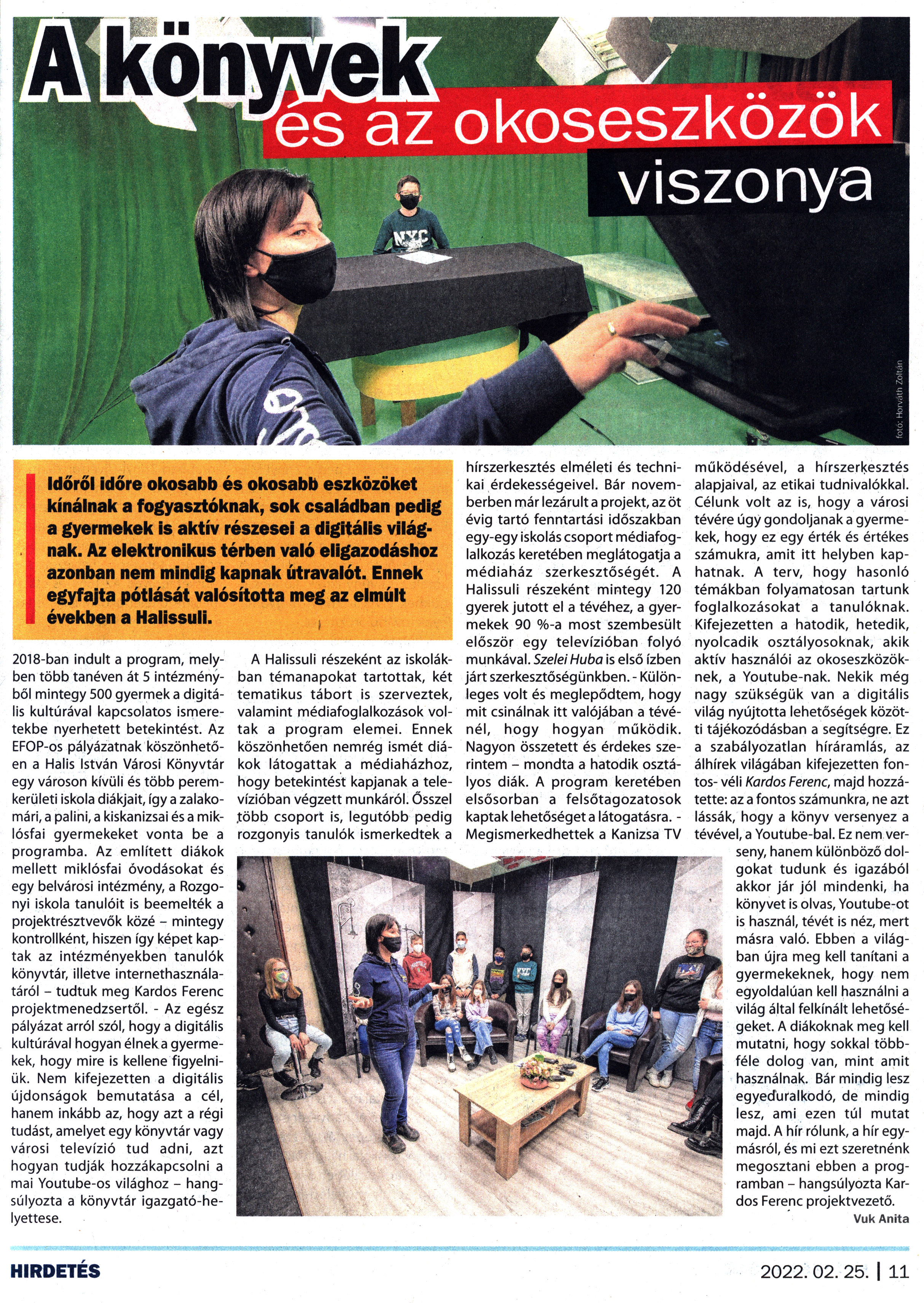 Nyilvános 1333 | 1815 | Kanizsa 2022. február 25. 4. szám 11. oldal | A könyvek és az okoseszközök viszonya Időről időre okosabb és okosabb eszközöket kínálnak a fogyasztóknak, sok családban pedig a gyermekek is aktív részesei a digitális világnak. Az elektronikus térben való eligazodáshoz azonban nem mindig kapnak útravalót. Ennek egyfajta pótlását valósította meg az elmúlt években a Halissuli. 2018-ban indult a program, melyben több tanéven át 5 intézményből mintegy 500 gyermek a digitális kultúrával kapcsolatos ismeretekbe nyerhetett betekintést. Az EFOP-os pályázatnak köszönhetően a Halis István Városi Könyvtár egy városon kívüli és több peremkerületi iskola diákjait, így a zalakomári, a palini, a kiskanizsai és a miklósfai gyermekeket vonta be a programba. Az említett diákok mellett miklósfai óvodásokat és egy belvárosi intézmény, a Rozgo-nyi iskola tanulóit is beemelték a projektrésztvevők közé - mintegy kontrollként, hiszen így képet kaptak az intézményekben tanulók könyvtár, illetve internethasználatáról - tudtuk meg Kardos Ferenc projektmenedzsertől. - Az egész pályázat arról szól, hogy a digitális kultúrával hogyan élnek a gyermekek, hogy mire is kellene figyelniük. Nem kifejezetten a digitális újdonságok bemutatása a cél, hanem inkább az, hogy azt a régi tudást, amelyet egy könyvtár vagy városi televízió tud adni, azt hogyan tudják hozzákapcsolni a mai Youtube-os világhoz - hangsúlyozta a könyvtár igazgató-helyettese. A Halissuli részeként az iskolákban témanapokat tartottak, két tematikus tábort is szerveztek, valamint médiafoglalkozások voltak a program elemei. Ennek köszönhetően nemrég ismét diákok látogattak a médiaházhoz, hogy betekintést kapjanak a televízióban végzett munkáról. Ősszel több csoport is, legutóbb pedig rozgonyis tanulók ismerkedtek a hírszerkesztés elméleti és technikai érdekességeivel. Bár novemberben már lezárult a projekt, az öt évig tartó fenntartási időszakban egy-egy iskolás csoport médiafoglalkozás keretében meglátogatja a médiaház szerkesztőségét. A Halissuli részeként mintegy 120 gyerek jutott el a tévéhez, a gyermekek 90 %-a most szembesült először egy televízióban folyó munkával. Szelei Huba is első ízben járt szerkesztőségünkben. - Különleges volt és meglepődtem, hogy mit csinálnak itt valójában a tévénél, hogy hogyan működik. Nagyon összetett és érdekes szerintem - mondta a hatodik osztályos diák. A program keretében elsősorban a felsőtagozatosok kaptak lehetőséget a látogatásra. -Megismerkedhettek a Kanizsa TV működésével, a hírszerkesztés alapjaival, az etikai tudnivalókkal. Célunk volt az is, hogy a városi tévére úgy gondoljanak a gyermekek, hogy ez egy érték és értékes számukra, amit itt helyben kaphatnak. A terv, hogy hasonló témákban folyamatosan tartunk foglalkozásokat a tanulóknak. Kifejezetten a hatodik, hetedik, nyolcadik osztályosoknak, akik aktív használói az okoseszközöknek, a Youtube-nak. Nekik még nagy szükségük van a digitális világ nyújtotta lehetőségek közötti tájékozódásban a segítségre. Ez a szabályozatlan híráramlás, az álhírek világában kifejezetten fontos- véli Kardos Ferenc, majd hozzátette: az a fontos számunkra, ne azt lássák, hogy a könyv versenyez a tévével, a Youtube-bal. Ez nem verseny, hanem különböző dolgokat tudunk és igazából akkor jár jól mindenki, ha könyvet is olvas, Youtube-ot is használ, tévét is néz, mert másra való. Ebben a világban újra meg kell tanítani a gyermekeknek, hogy nem egyoldalúan kell használni a világ által felkínált lehetőségeket. A diákoknak meg kell mutatni, hogy sokkal többféle dolog van, mint amit használnak. Bár mindig lesz egyeduralkodó, de mindig lesz, ami ezen túl mutat majd. A hír rólunk, a hír egymásról, és mi ezt szeretnénk megosztani ebben a programban - hangsúlyozta Kardos Ferenc projektvezető. Vuk Anita |