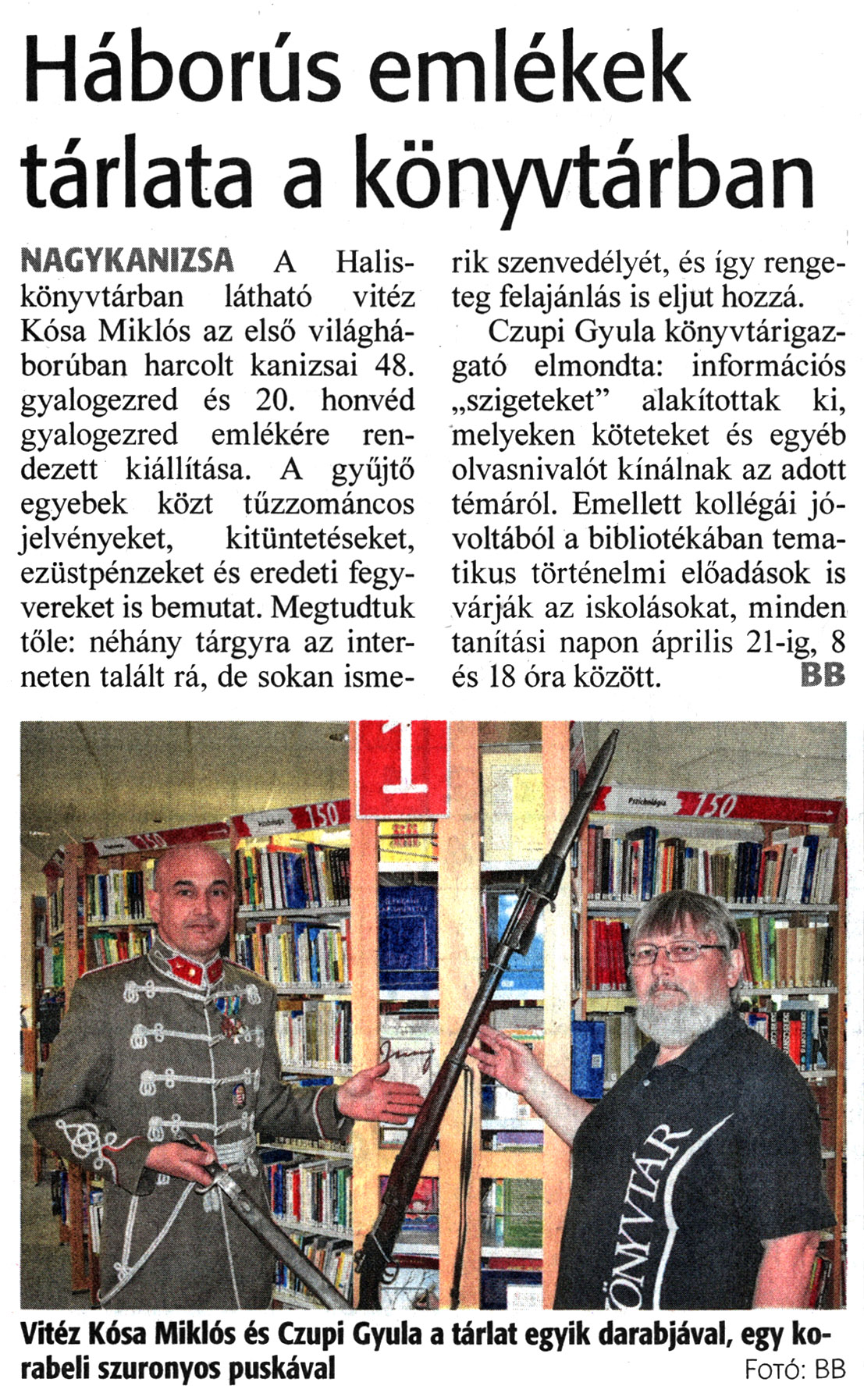 Nyilvános 1231 | 1743 | Zalai Hírlap 2022. március 23. 68. szám 20. oldal | Háborús emlékek tárlata a könyvtárban NAGYKANIZSA A Halis-könyvtárban látható vitéz Kósa Miklós az első világháborúban harcolt kanizsai 48. gyalogezred és 20. honvéd gyalogezred emlékére rendezett kiállítása. A gyűjtő egyebek közt tűzzománcos jelvényeket, kitüntetéseket, ezüstpénzeket és eredeti fegyvereket is bemutat. Megtudtuk tőle: néhány tárgyra az interneten talált rá, de sokan ismerik szenvedélyét, és így rengeteg felajánlás is eljut hozzá. Czupi Gyula könyvtárigazgató elmondta: információs „szigeteket" alakítottak ki, melyeken köteteket és egyéb olvasnivalót kínálnak az adott témáról. Emellett kollégái jóvoltából a bibliotékában tematikus történelmi előadások is várják az iskolásokat, minden tanítási napon április 21-ig, 8 és 18 óra között. BB Vitéz Kósa Miklós és Czupi Gyula a tárlat egyik darabjával, egy korabeli szuronyos puskával Fotó: BE |