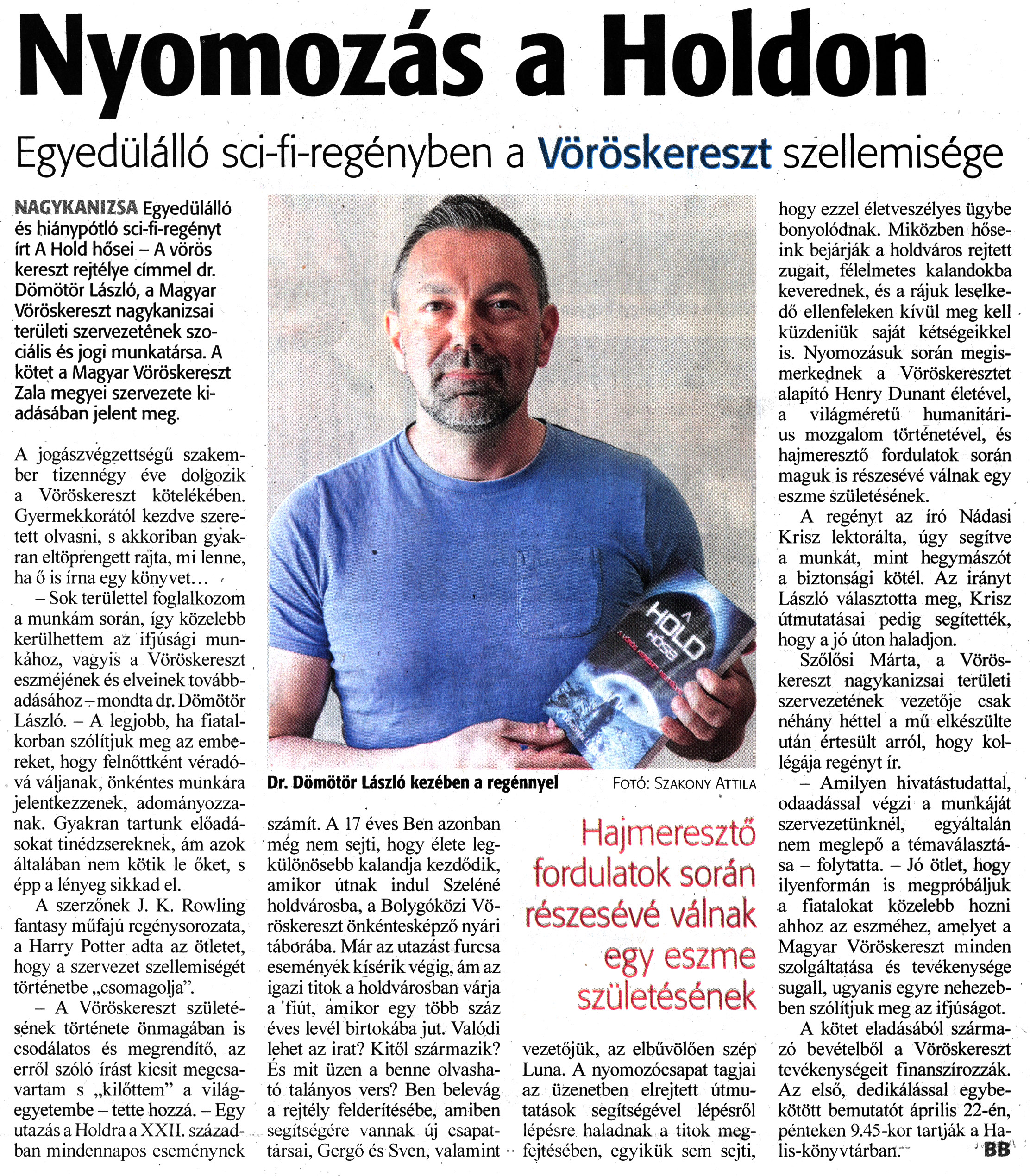 Nyilvános 1198 | 1432 | Zalai Hírlap 2022. április 21. 91. szám 11. oldal | Nyomozás a Holdon Egyedülálló sci-fi-regényben a Vöröskereszt szellemisége NAGYKANIZSA Egyedülálló és hiánypótló sci-fi-regényt írt A Hold hősei - A vörös kereszt rejtélye címmel dr. Dömötör László, a Magyar Vöröskereszt nagykanizsai területi szervezetének szociális és jogi munkatársa. A kötet a Magyar Vöröskereszt Zala megyei szervezete kiadásában jelent meg. A jogászvégzettségű szakember tizennégy éve dolgozik a Vöröskereszt kötelékében. Gyermekkorától kezdve szeretett olvasni, s akkoriban gyakran eltöprengett rajta, mi lenne, ha ő is írna egy könyvet... - - Sok területtel foglalkozom a munkám során, így közelebb kerülhettem az iijúsági munkához, vagyis a Vöröskereszt eszméjének és elveinek továbbadásához - mondta dr. Dömötör László. - A legjobb, ha fiatalkorban szólítjuk meg az embereket, hogy felnőttként véradóvá váljanak, önkéntes munkára jelentkezzenek, adományozzanak. Gyakran tartunk előadásokat tinédzsereknek, ám azok általában nem kötik le őket, s épp a lényeg sikkad el. A szerzőnek J. K. Rowling fantasy műfajú regény sorozata, a Harry Potter adta az ötletet, hogy a szervezet szellemiségét történetbe „csomagolja". - A Vöröskereszt születésének története önmagában is csodálatos és megrendítő, az erről szóló írást kicsit megcsavartam s „kilőttem" a világegyetembe - tette hozzá. - Egy utazás a Holdra a XXII. században mindennapos eseménynek számít. A 17 éves Ben azonban még nem sejti, hogy élete legkülönösebb kalandja kezdődik, amikor útnak indul Szeléné holdvárosba, a Bolygóközi Vöröskereszt önkéntesképző nyári táborába. Már az utazást furcsa események kísérik végig, ám az igazi titok a holdvárosban várja a ''fiút, ámikor egy több száz éves levél birtokába jut. Valódi lehet az irat? Kitől származik? És mit üzen a benne olvasható talányos vers? Ben belevág a rejtély felderítésébe, amiben segítségére vannak új csapattársai, Gergő és Sven, valamint vezetőjük, az elbűvölően szép Luna. A nyomozócsapat tagjai az üzenetben elrejtett útmutatások segítségével lépésről lépésre haladnak a titok megfejtésében, egyikük sem sejti, hogy ezzel életveszélyes ügybe bonyolódnak. Miközben hőseink bejárják a holdváros rejtett zugait, félelmetes kalandokba keverednek, és a rájuk leselkedő ellenfeleken kívül meg kell küzdeniük saját kétségeikkel is. Nyomozásuk során megismerkednek a Vöröskeresztet alapító Henry Dunant életével, a világméretű humanitárius mozgalom történetével, és hajmeresztő fordulatok során maguk is részesévé válnak egy eszme születésének. A regényt az író Nádasi Krisz lektorálta, úgy segítve a munkát, mint hegymászót a biztonsági kötél. Az irányt László választotta meg, Krisz útmutatásai pedig segítették, hogy a jó úton haladjon. Szőlősi Márta, a Vöröskereszt nagykanizsai területi szervezetének vezetője csak néhány héttel a mű elkészülte után értesült arról, hogy kollégája regényt ír. - Amilyen hivatástudattal, odaadással végzi a munkáját szervezetünknél, egyáltalán nem meglepő a témaválasztása - folytatta. - Jó ötlet, hogy ilyenformán is megpróbáljuk a fiatalokat közelebb hozni ahhoz az eszméhez, amelyet a Magyar Vöröskereszt minden szolgáltatása és tevékenysége sugall, ugyanis egyre nehezebben szólítjuk meg az ifjúságot. A kötet eladásából származó bevételből a Vöröskereszt tevékenységeit finanszírozzák. Az első, dedikálással egybekötött bemutatót április 22-én, pénteken 9.45-kor tartják a Halis-könyvtárban. " J BB Dr. Dömötör László kezében a regénnyel Fotó: Szakony Attila |