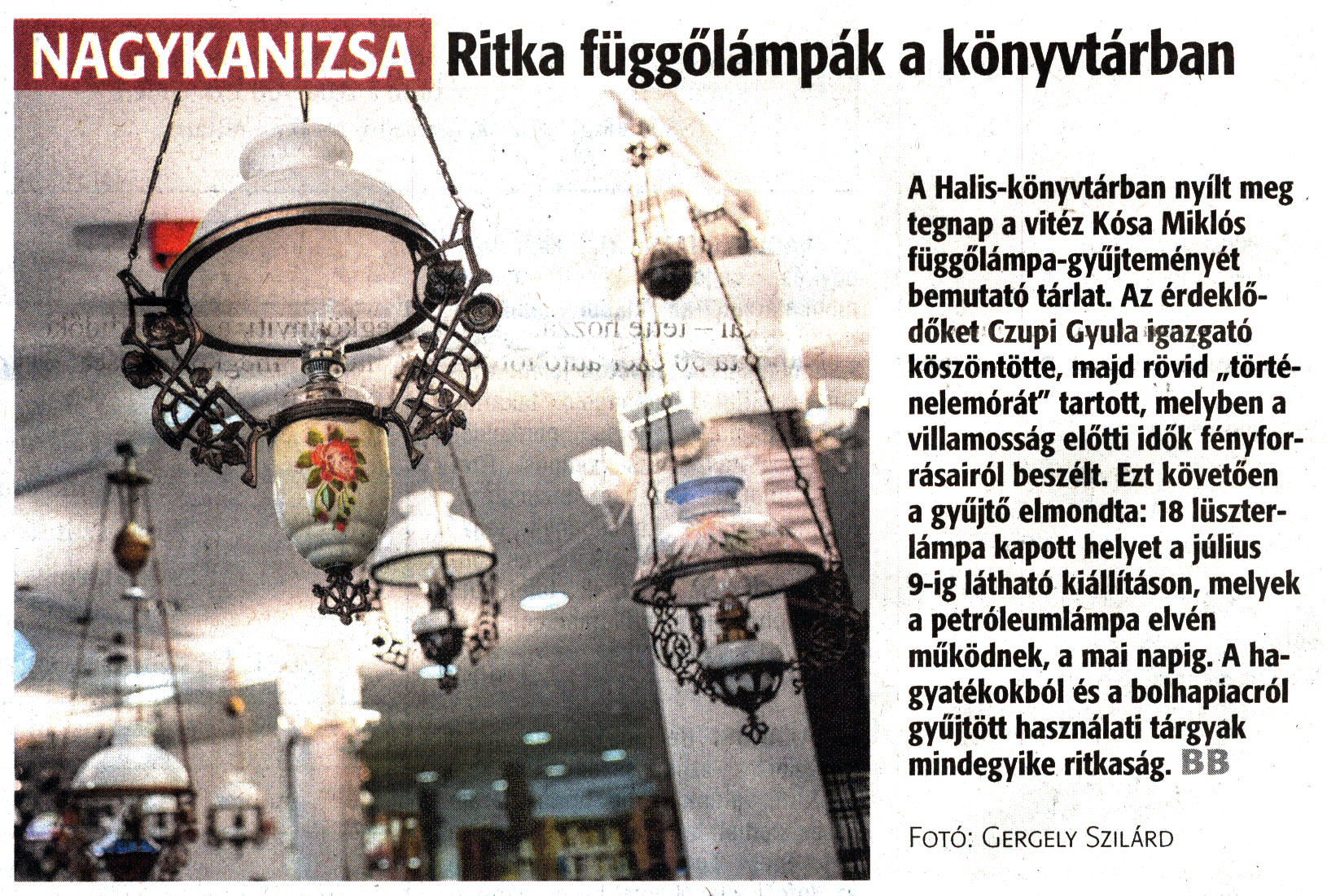Nyilvános 1234 | 1775 | Zalai Hírlap 2022. május 7. 105. szám 3. oldal | Ritka függőlámpák a könyvtárban A Halis-könyvtárban nyílt meg tegnap a vitéz Kósa Miklós függőlámpa-gyűjteményét bemutató tárlat. Az érdeklődőket Czupi Gyula igazgató köszöntötte, majd rövid „történelemórát" tartott, melyben a villamosság előtti idők fényforrásairól beszélt. Ezt követően a gyűjtő elmondta: 18 lüszter-lámpa kapott helyet a július 9-ig látható kiállításon, melyek a petróleumlámpa elvén működnek, a mai napig. A hagyatékokból és a bolhapiacról gyűjtött használati tárgyak mindegyike ritkaság. SB Fotó: Gergely Szilárd |
