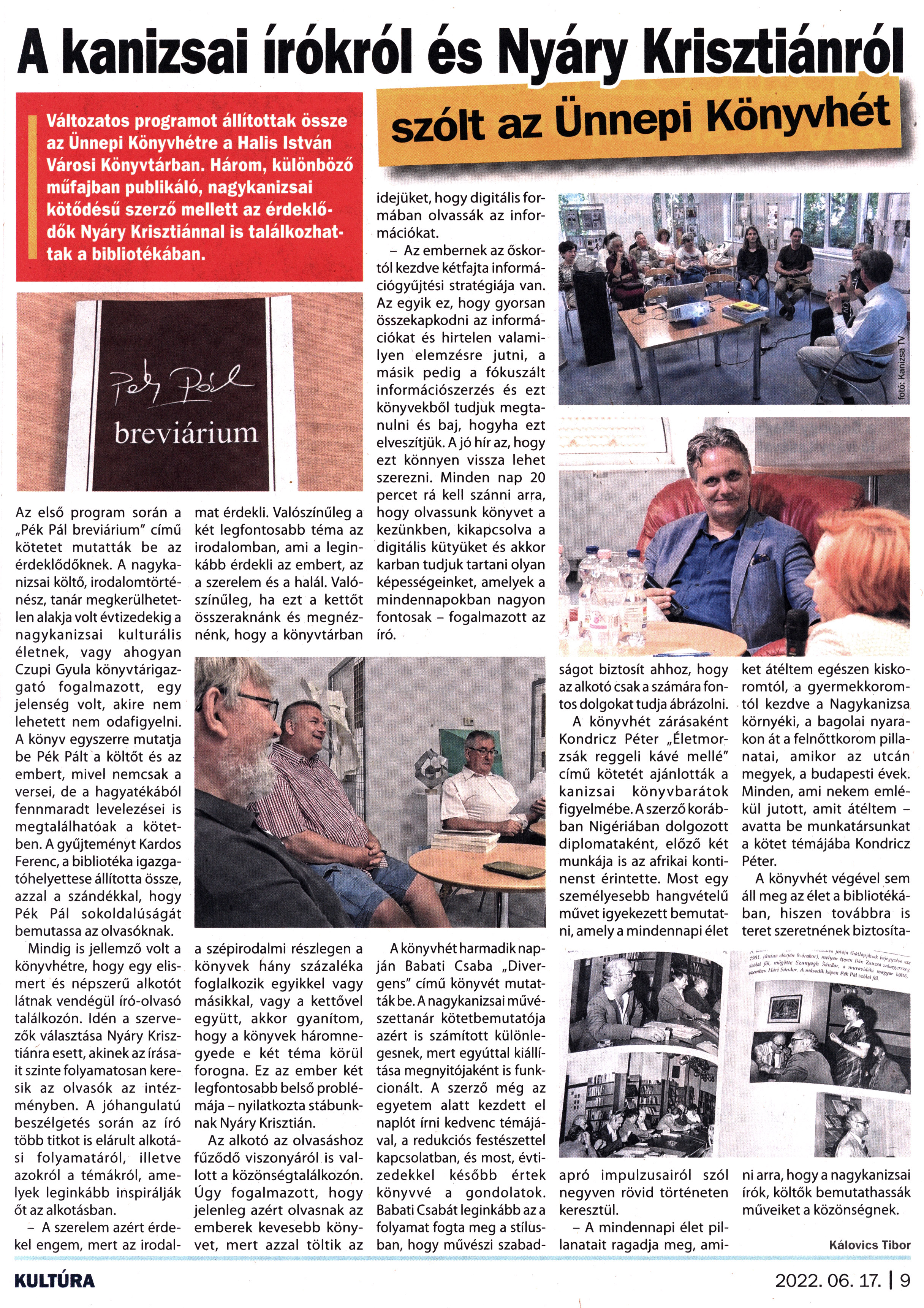 Nyilvános 1332 | 2277 | Kanizsa 2022. június 17. 12. szám 9. oldal | A kanizsai írókról és Nyáry Krisztiánról szólt az Ünnepi Könyvhét Változatos programot állítottak össze az Ünnepi Könyvhétre a Halis István Városi Könyvtárban. Három, különböző műfajban publikáló, nagykanizsai kötődésű szerző mellett az érdeklődők Nyáry Krisztiánnal is találkozhattak a bibliotékában. Az első program során a „Pék Pál breviárium" című kötetet mutatták be az érdeklődőknek. A nagykanizsai költő, irodalomtörténész, tanár megkerülhetetlen alakja volt évtizedekig a nagykanizsai kulturális életnek, vagy ahogyan Czupi Gyula könyvtárigazgató fogalmazott, egy jelenség volt, akire nem lehetett nem odafigyelni. A könyv egyszerre mutatja be Pék Pált a költőt és az embert, mivel nemcsak a versei, de a hagyatékából fennmaradt levelezései is megtalálhatóak a kötetben. A gyűjteményt Kardos Ferenc, a bibliotéka igazgatóhelyettese állította össze, azzal a szándékkal, hogy Pék Pál sokoldalúságát bemutassa az olvasóknak. Mindig is jellemző volt a könyvhétre, hogy egy elismert és népszerű alkotót látnak vendégül író-olvasó találkozón. Idén a szervezők választása Nyáry Krisztiánra esett, akinek az írásait szinte folyamatosan keresik az olvasók az intézményben. A jóhangulatú beszélgetés során az író több titkot is elárult alkotási folyamatáról, illetve azokról a témákról, amelyek leginkább inspirálják őt az alkotásban. - A szerelem azért érdekel engem, mert az irodalmat érdekli. Valószínűleg a két legfontosabb téma az irodalomban, ami a leginkább érdekli az embert, az a szerelem és a halál. Valószínűleg, ha ezt a kettőt összeraknánk és megnéznénk, hogy a könyvtárban a szépirodalmi részlegen a könyvek hány százaléka foglalkozik egyikkel vagy másikkal, vagy a kettővel együtt, akkor gyanítom, hogy a könyvek háromnegyede e két téma körül forogna. Ez az ember két legfontosabb belső problémája - nyilatkozta stábunknak Nyáry Krisztián. Az alkotó az olvasáshoz fűződő viszonyáról is vallott a közönségtalálkozón. Úgy fogalmazott, hogy jelenleg azért olvasnak az emberek kevesebb könyvet, mert azzal töltik az idejüket, hogy digitális formában olvassák az információkat. - Az embernek az őskortól kezdve kétfajta információgyűjtési stratégiája van. Az egyik ez, hogy gyorsan összekapkodni az információkat és hirtelen valamilyen elemzésre jutni, a másik pedig a fókuszált információszerzés és ezt könyvekből tudjuk megtanulni és baj, hogyha ezt elveszítjük. A jó hír az, hogy ezt könnyen vissza lehet szerezni. Minden nap 20 percet rá kell szánni arra, hogy olvassunk könyvet a kezünkben, kikapcsolva a digitális kütyüket és akkor karban tudjuk tartani olyan képességeinket, amelyek a mindennapokban nagyon fontosak - fogalmazott az író. A könyvhét harmadik napján Babati Csaba „Divergens" című könyvét mutatták be. A nagykanizsai művészettanár kötetbemutatója azért is számított különlegesnek, mert egyúttal kiállítása megnyitójaként is funkcionált. A szerző még az egyetem alatt kezdett el naplót írni kedvenc témájával, a redukciós festészettel kapcsolatban, és most, évtizedekkel később értek könyvvé a gondolatok. Babati Csabát leginkább az a folyamat fogta meg a stílusban, hogy művészi szabad- ságot biztosít ahhoz, hogy az alkotó csak a számára fontos dolgokat tudja ábrázolni. A könyvhét zárásaként Kondricz Péter „Életmorzsák reggeli kávé mellé" című kötetét ajánlották a kanizsai könyvbarátok figyelmébe. A szerző korábban Nigériában dolgozott diplomataként, előző két munkája is az afrikai kontinenst érintette. Most egy személyesebb hangvételű művet igyekezett bemutatni,amelya mindennapi élet apró impulzusairól szól negyven rövid történeten keresztül. - A mindennapi élet pillanatait ragadja meg, amiket átéltem egészen kiskoromtól, a gyermekkoromtól kezdve a Nagykanizsa környéki, a bagolai nyarakon át a felnőttkorom pillanatai, amikor az utcán megyek, a budapesti évek. Minden, ami nekem emlékül jutott, amit átéltem -avatta be munkatársunkat a kötet témájába Kondricz Péter. A könyvhét végével sem áll meg az élet a bibliotékában, hiszen továbbra is teret szeretnének biztosítani arra, hogy a nagykanizsai írók, költők bemutathassák műveiket a közönségnek. Kálovics Tibor KULTÚRA 2022. 06. 17. | 9 |