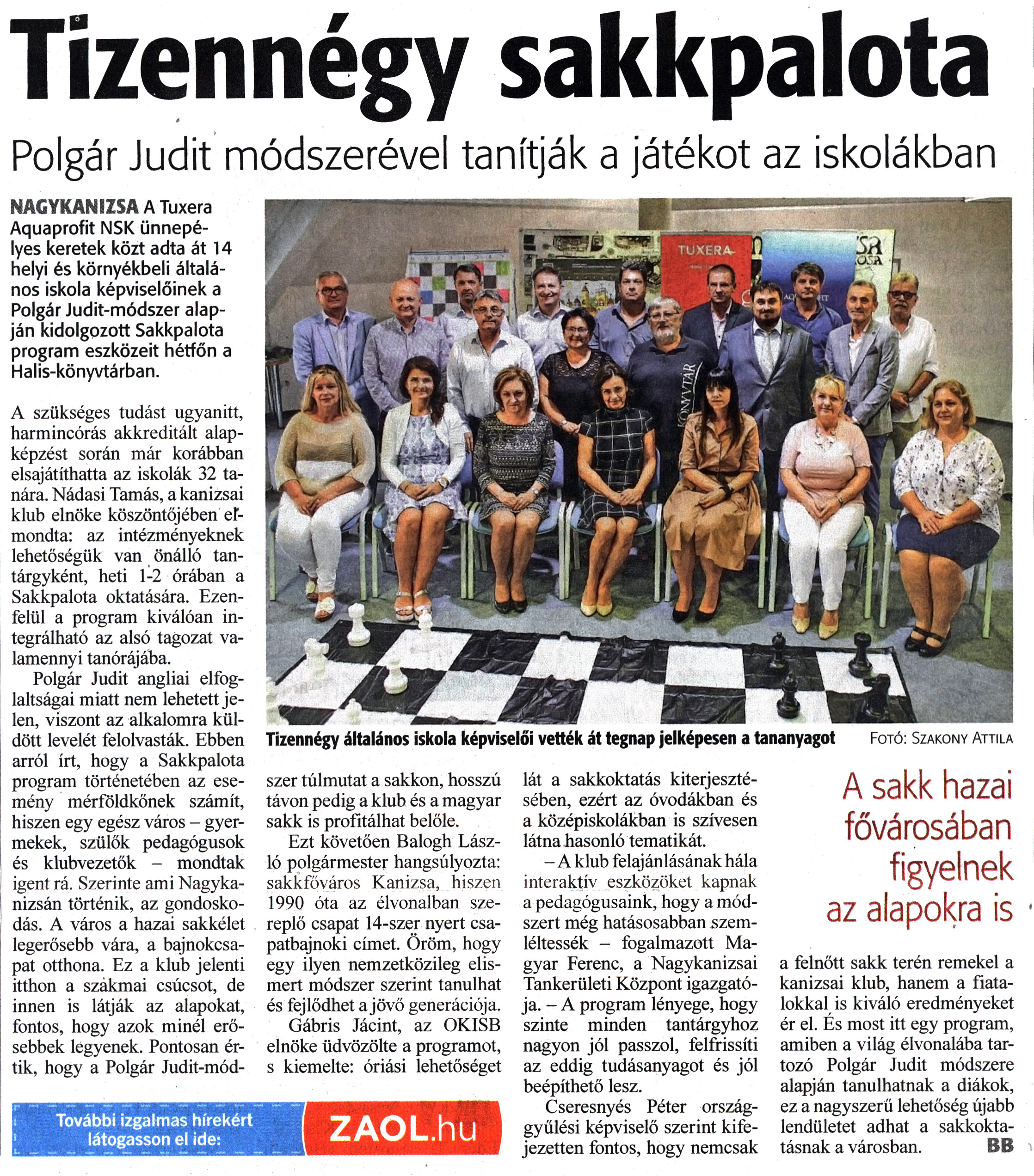 Nyilvános 1219 | 1537 | Zalai Hírlap 2022 szeptember 6. 207. szám 13. oldal | Tizennégy sakkpalota Polgár Judit módszerével tanítják a játékot az iskolákban NAGYKANIZSA A Tuxera Aquaprofit NSK ünnepélyes keretek közt adta át 14 helyi és környékbeli általános iskola képviselőinek a Polgár Judit-módszer alapján kidolgozott Sakkpalota program eszközeit hétfőn a Halis-könyvtárban. A szükséges tudást ugyanitt, harmincórás akkreditált alapképzést során már korábban elsajátíthatta az iskolák 32 tanára. Nádasi Tamás, a kanizsai klub elnöke köszöntőjében elmondta: az intézményeknek lehetőségük van önálló tantárgyként, heti 1-2 órában a Sakkpalota oktatására. Ezenfelül a program kiválóan integrálható az alsó tagozat valamennyi tanórájába. Polgár Judit angliai elfoglaltságai miatt nem lehetett jelen, viszont az alkalomra küldött levelét felolvasták. Ebben arról írt, hogy a Sakkpalota program történetében az esemény mérföldkőnek számít, hiszen egy egész város - gyermekek, szülők pedagógusok és klubvezetők - mondtak igent rá. Szerinte ami Nagykanizsán történik, az gondoskodás. A város a hazai sakkélet legerősebb vára, a bajnokcsapat otthona. Ez a klub jelenti itthon a szákmai csúcsot, de innen is látják az alapokat, fontos, hogy azok minél erősebbek legyenek. Pontosan értik, hogy a Polgár Judit-módszer túlmutat a sakkon, hosszú távon pedig a klub és a magyar sakk is profitálhat belőle. Ezt követően Balogh László polgármester hangsúlyozta: sakkfőváros Kanizsa, hiszen 1990 óta az élvonalban szereplő csapat 14-szer nyert csapatbajnoki címet. Öröm, hogy egy ilyen nemzetközileg elismert módszer szerint tanulhat és fejlődhet a jövő generációja. Gábris Jácint, az OKISB elnöke üdvözölte a programot, s kiemelte: óriási lehetőséget lát a sakkoktatás kiterjesztésében, ezért az óvodákban és a középiskolákban is szívesen látna hasonló tematikát. - A klub felajánlásának hála interaktív eszközöket kapnak a pedagógusaink, hogy a módszert még hatásosabban szemléltessék - fogalmazott Magyar Ferenc, a Nagykanizsai Tankerületi Központ igazgatója. - A program lényege, hogy szinte minden tantárgyhoz nagyon jól passzol, felfrissíti az eddig tudásanyagot és jól beépíthető lesz. Cseresnyés Péter országgyűlési képviselő szerint kifejezetten fontos, hogy nemcsak a felnőtt sakk terén remekel a kanizsai klub, hanem a fiatalokkal is kiváló eredményeket ér el. És most itt egy program, amiben a világ élvonalába tartozó Polgár Judit módszere alapján tanulhatnak a diákok, ez a nagyszerű lehetőség újabb lendületet adhat a sakkoktatásnak a városban. BB Tizennégy általános iskola képviselői vették át tegnap jelképesen a tananyagot Fotó: Szakony Attila |