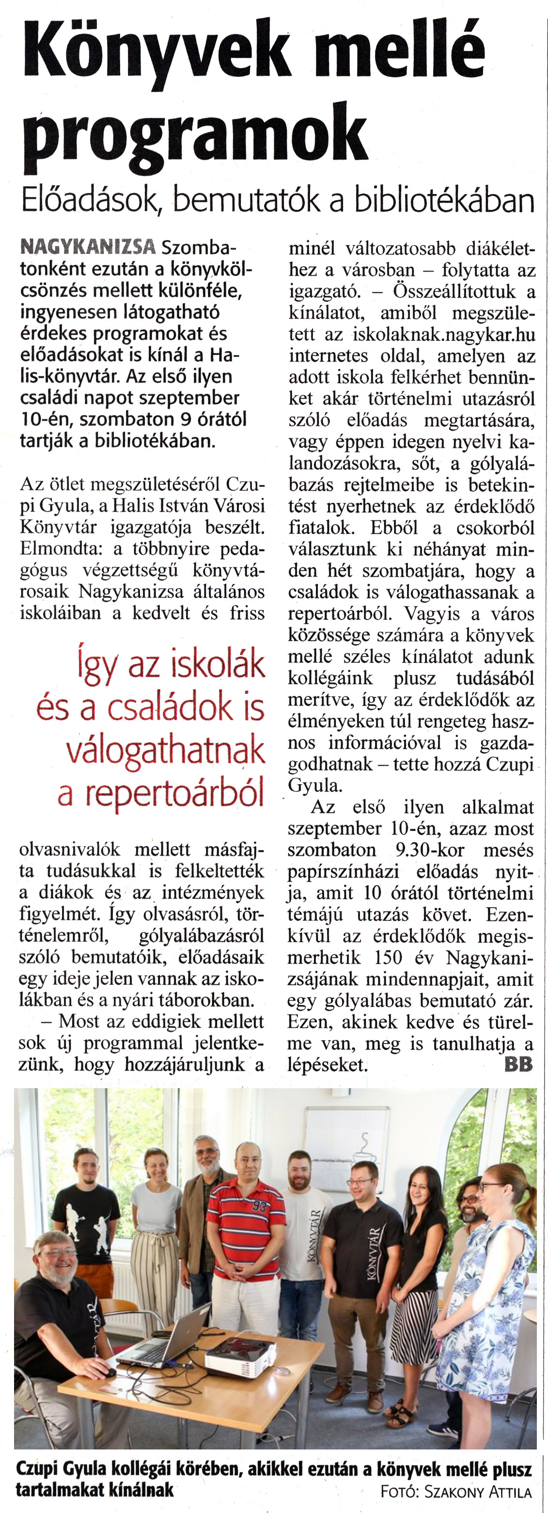 Nyilvános 1252 | 1740 | Zalai Hírlap 2022. szeptember 9. 210. szám 3. oldal | Könyvek mellé programok Előadások, bemutatók a bibliotékában NAGYKANIZSA Szombatonként ezután a könyvkölcsönzés mellett különféle, ingyenesen látogatható érdekes programokat és előadásokat is kínál a Halis-könyvtár. Az első ilyen családi napot szeptember 10-én, szombaton 9 órától tartják a bibliotékában. Az ötlet megszületéséről Czupi Gyula, a Halis István Városi Könyvtár igazgatója beszélt. Elmondta: a többnyire pedagógus végzettségű könyvtárosaik Nagykanizsa általános iskoláiban a kedvelt és friss olvasnivalók mellett másfajta tudásukkal is felkeltették a diákok és az intézmények figyelmét. így olvasásról, történelemről, gólyalábazásról szóló bemutatóik, előadásaik egy ideje jelen vannak az iskolákban és a nyári táborokban. - Most az eddigiek mellett sok új programmal jelentkezünk, hogy hozzájáruljunk a minél változatosabb diákélethez a városban - folytatta az igazgató. - Összeállítottuk a kínálatot, amiből megszületett az iskolaknak.nagykar.hu internetes oldal, amelyen az adott iskola felkérhet bennünket akár történelmi utazásról szóló előadás megtartására, vagy éppen idegen nyelvi kalandozásokra, sőt, a gólyalábazás rejtelmeibe is betekintést nyerhetnek az érdeklődő fiatalok. Ebből a csokorból választunk ki néhányat minden hét szombatjára, hogy a családok is válogathassanak a repertoárból. Vagyis a város közössége számára a könyvek mellé széles kínálatot adunk kollégáink plusz tudásából merítve, így az érdeklődők az élményeken túl rengeteg hasznos információval is gazdagodhatnak - tette hozzá Czupi Gyula. Az első ilyen alkalmat szeptember 10-én, azaz most szombaton 9.30-kor mesés papírszínházi előadás nyitja, amit 10 órától történelmi témájú utazás követ. Ezenkívül az érdeklődők megismerhetik 150 év Nagykanizsájának mindennapjait, amit egy gólyalábas bemutató zár. Ezen, akinek kedve és türelme van, meg is tanulhatja a lépéseket. BB Czupi Gyula kollégái körében, akikkel ezután a könyvek mellé plusz tartalmakat kínálnak Fotó: Szakony Attila |