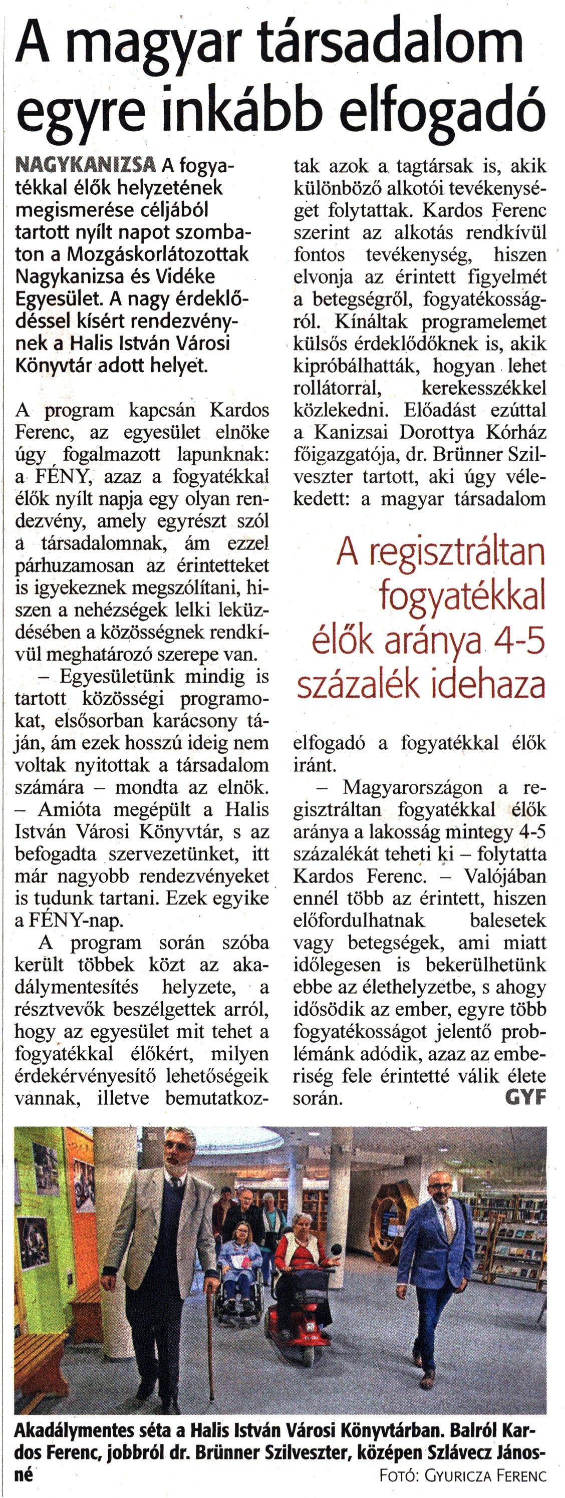 Nyilvános 1316 | 1622 | Zalai Hírlap 2022. október 17. 242. szám 2. oldal | A magyar társadalom egyre inkább elfogadó NAGYKANIZSA A fogyatékkal élők helyzetének megismerése céljából tartott nyílt napot szombaton a Mozgáskorlátozottak Nagykanizsa és Vidéke Egyesület. A nagy érdeklődéssel kísért rendezvénynek a Halis István Városi Könyvtár adott helyét. A program kapcsán Kardos Ferenc, az egyesület elnöke úgy fogalmazott lapunknak: a FÉNY, azaz a fogyatékkal élők nyílt napja egy olyan rendezvény, amely egyrészt szól a társadalomnak, ám ezzel párhuzamosan az érintetteket is igyekeznek megszólítani, hiszen a nehézségek lelki leküzdésében a közösségnek rendkívül meghatározó szerepe van. - Egyesületünk mindig is tartott közösségi programokat, elsősorban karácsony táján, ám ezek hosszú ideig nem voltak nyitottak a társadalom számára - mondta az elnök. - Amióta megépült a Halis István Városi Könyvtár, s az befogadta szervezetünket, itt már nagyobb rendezvényeket is tudunk tartani. Ezek egyike a FÉNY-nap. A program során szóba került többek közt az akadálymentesítés helyzete, a résztvevők beszélgettek arról, hogy az egyesület mit tehet a fogyatékkal élőkért, milyen érdekérvényesítő lehetőségeik vannak, illetve bemutatkoztak azok a tagtársak is, akik különböző alkotói tevékenységet folytattak. Kardos Ferenc szerint az alkotás rendkívül fontos tevékenység, hiszen elvonja az érintett figyelmét a betegségről, fogyatékosságról. Kínáltak programelemet külsős érdeklődőknek is, akik kipróbálhatták, hogyan lehet rollátorral, kerekesszékkel közlekedni. Előadást ezúttal a Kanizsai Dorottya Kórház főigazgatója, dr. Brünner Szilveszter tartott, aki úgy vélekedett: a magyar társadalom elfogadó a fogyatékkal élők iránt. - Magyarországon a regisztráltan fogyatékkal élők aránya a lakosság mintegy 4-5 százalékát teheti ki - folytatta Kardos Ferenc. - Valójában ennél több az érintett, hiszen előfordulhatnak balesetek vagy betegségek, ami miatt időlegesen is bekerülhetünk ebbe az élethelyzetbe, s ahogy idősödik az ember, egyre több fogyatékosságot jelentő problémánk adódik, azaz az emberiség fele érintetté válik élete során. CYF Akadálymentes séta a Halis István Városi Könyvtárban. Balról Kardos Ferenc, jobbról dr. Brünner Szilveszter, középen Szlávecz Jánosné Fotó: Cvuricza Ferenc |