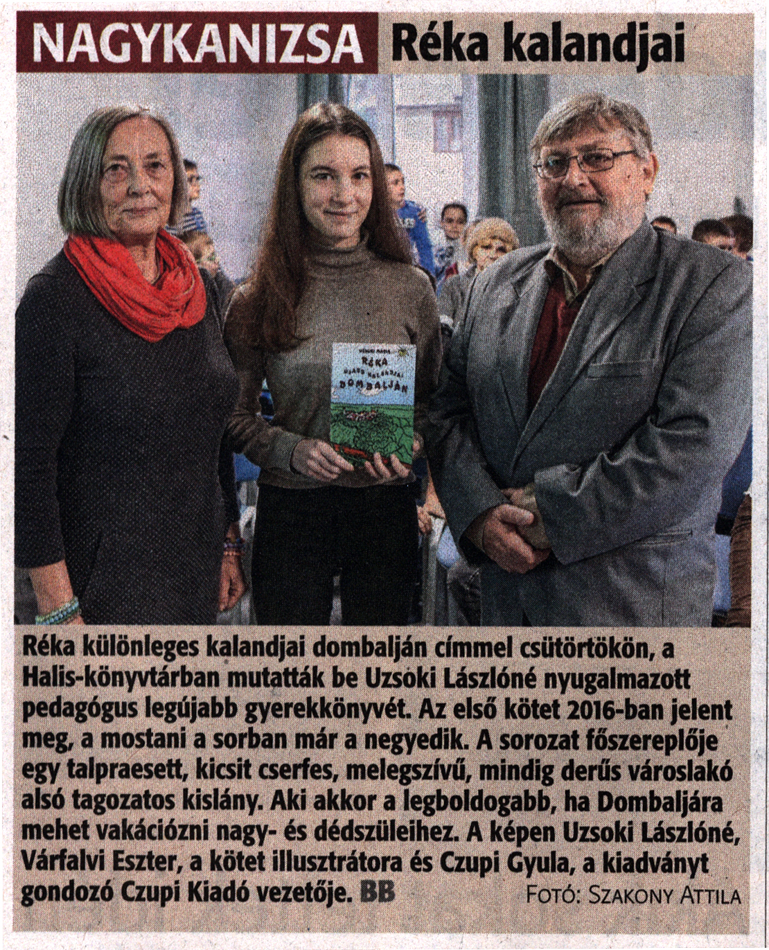 Nyilvános 1230 | 3496 | Zalai Hírlap 2022. december 9. 287. szám 3. oldal | Réka kalandjai NAGYKANIZSA Réka különleges kalandjai dombalján címmel csütörtökön, a Halis-könyvtárban mutatták be Uzsoki Lászlóné nyugalmazott pedagógus legújabb gyerekkönyvét Az első kötet 2016-ban jelent meg, a mostani a sorban már a negyedik. A sorozat főszereplője egy talpraesett, kicsit cserfes, melegszívű, mindig derűs városlakó alsó tagozatos kislány. Aki akkor a legboldogabb, ha Dombaljára mehet vakációzni nagy- és dédszüleihez. A képen Uzsoki Lászlóné, Várfalvi Eszter, a kötet illusztrátora és Czupi Gyula, a kiadványt gondozó Czupi Kiadó vezetője. BB Fotó: Szakony Attila |