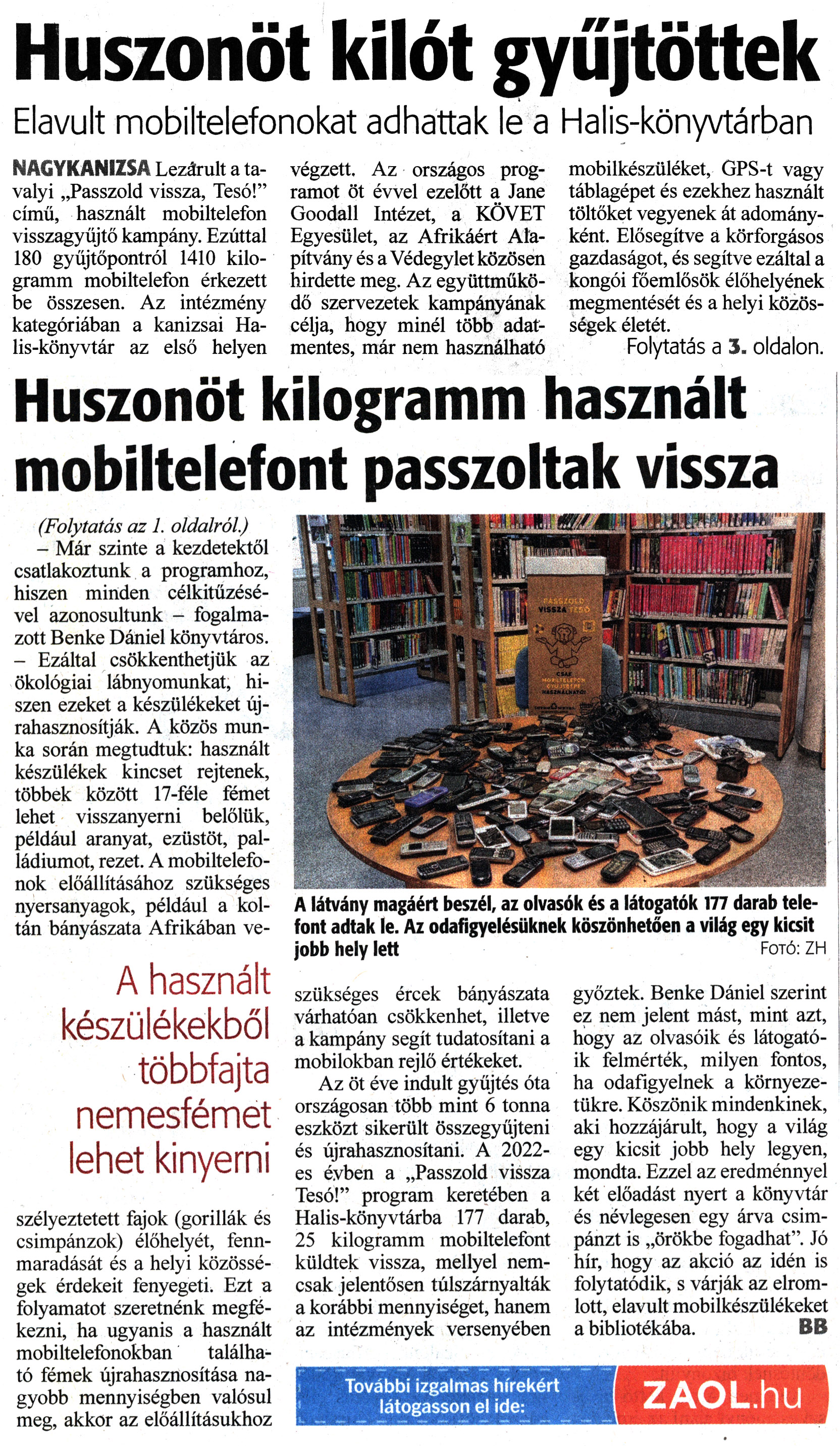 Nyilvános 1058 | 1229 | Zalai Hírlap 2023. január 24. 20. szám, 1, 3. oldal | Huszonöt kilót gyűjtöttek Elavult mobiltelefonokat adhattak le a Halis-könyvtárban NAGYKANIZSA Lezárult a tavalyi „Passzold vissza, Tesó!" című, használt mobiltelefon visszagyűjtő kampány. Ezúttal 180 gyűjtőpontról 1410 kilogramm mobiltelefon érkezett be összesen. Az intézmény kategóriában a kanizsai Halis-könyvtár az első helyen végzett. Az országos programot öt évvel ezelőtt a Jane Goodall Intézet, a KÖVET Egyesület, az Afrikáért Alapítvány és a Védegylet közösen hirdette meg. Az együttműködő szervezetek kampányának célja, hogy minél több adatmentes, már nem használható mobilkészüléket, GPS-t vagy táblagépet és ezekhez használt töltőket vegyenek át adományként. Elősegítve a körforgásos gazdaságot, és segítve ezáltal a kongói főemlősök élőhelyének megmentését és a helyi közösségek életét. Folytatás a 3. oldalon. Huszonöt kilogramm használt mobiltelefont passzoltak vissza (Folytatás az 1. oldalról.) - Már szinte a kezdetektől csatlakoztunk a programhoz, hiszen minden célkitűzésével azonosultunk - fogalmazott Benke Dániel könyvtáros. - Ezáltal csökkenthetjük az ökológiai lábnyomunkat, hiszen ezeket a készülékeket újrahasznosítják. A közös munka során megtudtuk: használt készülékek kincset rejtenek, többek között 17-féle fémet lehet visszanyerni belőlük, például aranyat, ezüstöt, palládiumot, rezet. A mobiltelefonok előállításához szükséges nyersanyagok, például a kol-tán bányászata Afrikában veszélyeztetett fajok (gorillák és csimpánzok) élőhelyét, fennmaradását és a helyi közösségek érdekeit fenyegeti. Ezt a folyamatot szeretnénk megfékezni, ha ugyanis a használt mobiltelefonokban található fémek újrahasznosítása nagyobb mennyiségben valósul meg, akkor az előállításukhoz szükséges ércek bányászata várhatóan csökkenhet, illetve a kampány segít tudatosítani a mobilokban rejlő értékeket. Az öt éve indult gyűjtés óta országosan több mint 6 tonna eszközt sikerült összegyűjteni és újrahasznosítani. A 2022-es évben a „Passzold vissza Tesó!" program keretében a Halis-könyvtárba 177 darab, 25 kilogramm mobiltelefont küldtek vissza, mellyel nemcsak jelentősen túlszárnyalták a korábbi mennyiséget, hanem az intézmények versenyében győztek. Benke Dániel szerint ez nem jelent mást, mint azt, hogy az olvasóik és látogatóik felmérték, milyen fontos, ha odafigyelnek a környezetükre. Köszönik mindenkinek, aki hozzájárult, hogy a világ egy kicsit jobb hely legyen, mondta. Ezzel az eredménnyel két előadást nyert a könyvtár és névlegesen egy árva csimpánzt is „örökbe fogadhat". Jó hír, hogy az akció az idén is folytatódik, s várják az elromlott, elavult mobilkészülékeket a bibliotékába. BB A látvány magáért beszél, az olvasók és a látogatók 177 darab telefont adtak le. Az odafigyelésüknek köszönhetően a világ egy kicsit jobb hely lett Fotó: ZH További izgalmas hírekért látogasson el ide: ZAOL.hu |