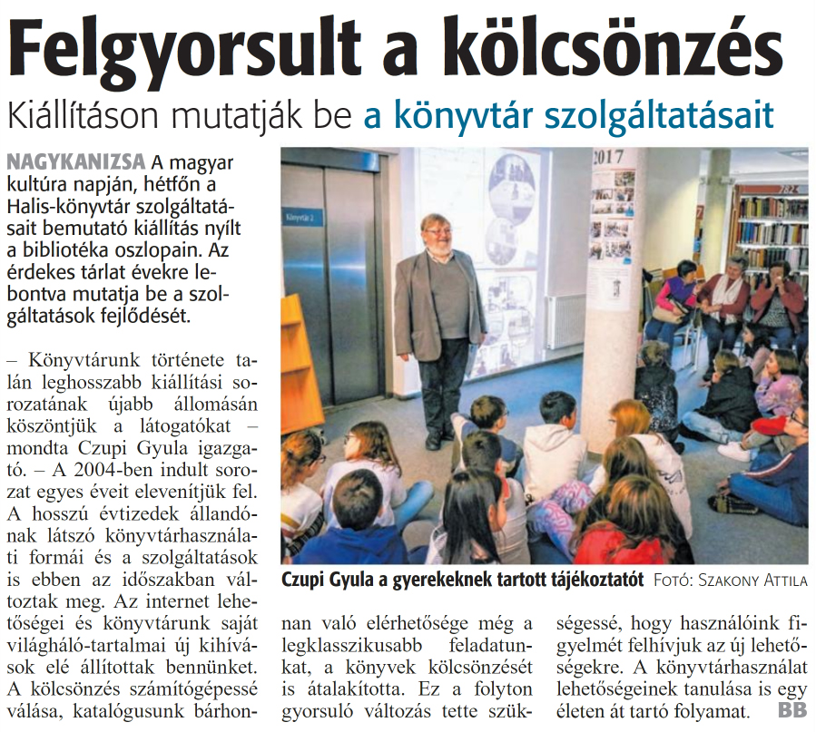 Nyilvános 1065 | 1560 | Zalai Hírlap 2024. január 23. 19. szám 16. oldal | Felgyorsult a kölcsönzés Kiállításon mutatják be a könyvtár szolgáltatásait NAGYKANIZSA A magyar kultúra napján, hétfőn a Halis-könyvtár szolgáltatásait bemutató kiállítás nyílt a bibliotéka oszlopain. Az érdekes tárlat évekre lebontva mutatja be a szolgáltatások fejlődését. - Könyvtárunk története talán leghosszabb kiállítási sorozatának újabb állomásán köszöntjük a látogatókat -mondta Czupi Gyula igazgató. - A 2004-ben indult sorozat egyes éveit elevenítjük fel. A hosszú évtizedek állandónak látszó könyvtárhasználati formái és a szolgáltatások is ebben az időszakban változtak meg. Az internet lehetőségei és könyvtárunk saját világháló-tartalmai új kihívások elé állítottak bennünket. A kölcsönzés számítógépessé válása, katalógusunk bárhonnan való elérhetősége még a legklasszikusabb feladatunkat, a könyvek kölcsönzését is átalakította. Ez a folyton gyorsuló változás tette szükségessé, hogy használóink figyelmét felhívjuk az új lehetőségekre. A könyvtárhasználat lehetőségeinek tanulása is egy életen át tartó folyamat. BB Czupi Gyula a gyerekeknek tartott tájékoztatót Fotó: Szakony Attila |