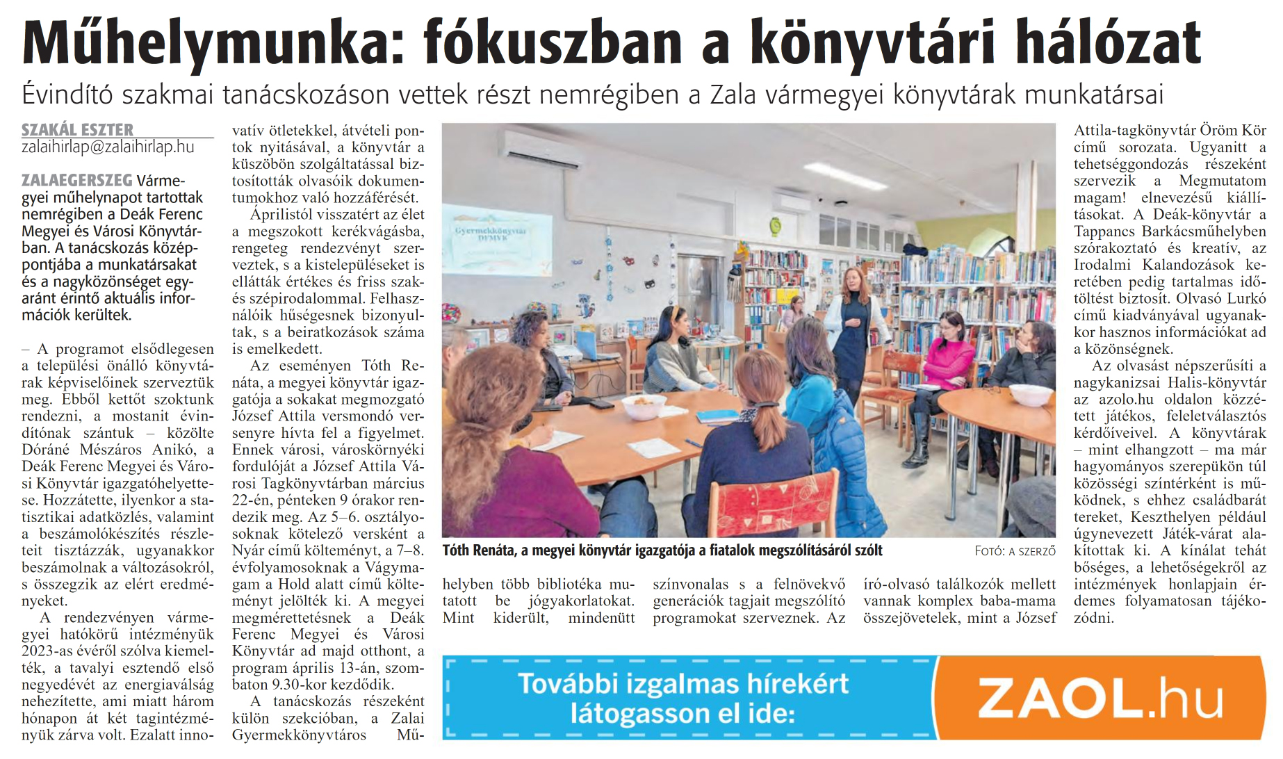 Nyilvános 1092 | 1413 | Zalai Hírlap 2024. február 13. 37. szám 5. oldal | Műhelymunka: fókuszban a könyvtári hálózat Évindító szakmai tanácskozáson vettek részt nemrégiben a Zala vármegyei könyvtárak munkatársai SZAKÁL ESZTER zalaihirlap@zalaihirlap.hu ZALAEGERSZEG Vármegyei műhelynapot tartottak nemrégiben a Deák Ferenc Megyei és Városi Könyvtárban. A tanácskozás középpontjába a munkatársakat és a nagyközönséget egyaránt érintő aktuális információk kerültek. - A programot elsődlegesen a települési önálló könyvtárak képviselőinek szerveztük meg. Ebből kettőt szoktunk rendezni, a mostanit évindítónak szántuk - közölte Dóráné Mészáros Anikó, a Deák Ferenc Megyei és Városi Könyvtár igazgatóhelyettese. Hozzátette, ilyenkor a statisztikai adatközlés, valamint a beszámolókészítés részleteit tisztázzák, ugyanakkor beszámolnak a változásokról, s összegzik az elért eredményeket. A rendezvényen vármegyei hatókörű intézményük 2023-as évéről szólva kiemelték, a tavalyi esztendő első negyedévét az energiaválság nehezítette, ami miatt három hónapon át két tagintézményük zárva volt. Ezalatt innovatív ötletekkel, átvételi pontok nyitásával, a könyvtár a küszöbön szolgáltatással biztosították olvasóik dokumentumokhoz való hozzáférését. Áprilistól visszatért az élet a megszokott kerékvágásba, rengeteg rendezvényt szerveztek, s a kistelepüléseket is ellátták értékes és friss szak- és szépirodalommal. Felhasználóik hűségesnek bizonyultak, s a beiratkozások száma is emelkedett. Az eseményen Tóth Renáta, a megyei könyvtár igazgatója a sokakat megmozgató József Attila versmondó versenyre hívta fel a figyelmet. Ennek városi, városkörnyéki fordulóját a József Attila Városi Tagkönyvtárban március 22-én, pénteken 9 órakor rendezik meg. Az 5-6. osztályosoknak kötelező versként a Nyár című költeményt, a 7-8. évfolyamosoknak a Vágymagam a Hold alatt című költeményt jelölték ki. A megyei megmérettetésnek a Deák Ferenc Megyei és Városi Könyvtár ad majd otthont, a program április 13-án, szombaton 9.30-kor kezdődik. A tanácskozás részeként külön szekcióban, a Zalai Gyermekkönyvtáros Műhelyben több bibliotéka mutatott be jógyakorlatokat. Mint kiderült, mindenütt színvonalas s a felnövekvő generációk tagjait megszólító programokat szerveznek. Az író-olvasó találkozók mellett vannak komplex baba-mama összejövetelek, mint a József Attila-tagkönyvtár Öröm Kör című sorozata. Ugyanitt a tehetséggondozás részeként szervezik a Megmutatom magam! elnevezésű kiállításokat. A Deák-könyvtár a Tappancs Barkácsmühelyben szórakoztató és kreatív, az Irodalmi Kalandozások keretében pedig tartalmas időtöltést biztosít. Olvasó Lurkó című kiadványával ugyanakkor hasznos információkat ad a közönségnek. Az olvasást népszerűsíti a nagykanizsai Halis-könyvtár az azolo.hu oldalon közzétett játékos, feleletválasztós kérdőíveivel. A könyvtárak - mint elhangzott - ma már hagyományos szerepükön túl közösségi színtérként is működnek, s ehhez családbarát tereket, Keszthelyen például úgynevezett Játék-várat alakítottak ki. A kínálat tehát bőséges, a lehetőségekről az intézmények honlapjain érdemes folyamatosan tájékozódni. Tóth Renáta, a megyei könyvtár igazgatója a fiatalok megszólításáról szólt Fotó: a szerző |