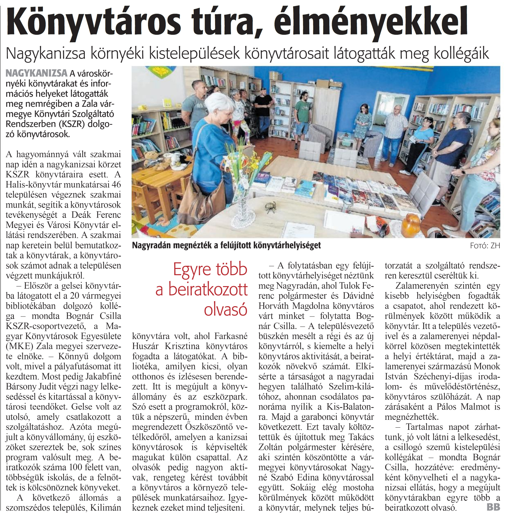 Nyilvános 949 | 1306 | Zalai Hírlap 2024. július 12. 161. szám 2. oldal | Könyvtáros túra, élményekkel NAGYKANIZSA A városkörnyéki könyvtárakat és információs helyeket látogatták meg nemrégiben a Zala vármegye Könyvtári Szolgáltató Rendszerben (KSZR) dolgozó könyvtárosok. A hagyománnyá vált szakmai nap idén a nagykanizsai körzet KSZR könyvtáraira esett. A Halis-könyvtár munkatársai 46 településen végeznek szakmai munkát, segítik a könyvtárosok tevékenységét a Deák Ferenc Megyei és Városi Könyvtár ellátási rendszerében. A szakmai nap keretein belül bemutatkoztak a könyvtárak, a könyvtárosok számot adnak a településen végzett munkájukról. - Először a gelsei könyvtárba látogatott el a 20 vármegyei bibliotékában dolgozó kolléga - mondta Bognár Csilla KSZR-csoportvezető, a Magyar Könyvtárosok Egyesülete (MKE) Zala megyei szervezete elnöke. - Könnyű dolgom volt, mivel a pályafutásomat itt kezdtem. Most pedig Jakabfiné Bársony Judit végzi nagy lelkesedéssel és kitartással a könyvtárosi teendőket. Gelse volt az utolsó, amely csatlakozott a szolgáltatáshoz. Azóta megújult a könyvállomány, új eszközöket szereztek be, sok színes program valósult meg. A beiratkozok száma 100 felett van, többségük iskolás, de a felnőttek is kölcsönöznek könyveket. A következő állomás a szomszédos település, Kilimán könyvtára volt, ahol Farkasné Huszár Krisztina könyvtáros fogadta a látogatókat. A bibliotéka, amilyen kicsi, olyan otthonos és ízlésesen berendezett. Itt is megújult a könyvállomány és az eszközpark. Szó esett a programokról, köztük a népszerű, minden évben megrendezett Oszköszöntő vetélkedőről, amelyen a kanizsai könyvtárosok is képviselték magukat külön csapattal. Az olvasók pedig nagyon aktívak, rengeteg kérést továbbít a könyvtáros a környező települések munkatársaihoz. Igyekeznek ezeket mind teljesíteni. - A folytatásban egy felújított könyvtárhelyiséget néztünk meg Nagyradán, ahol Tulok Ferenc polgármester és Dávidné Horváth Magdolna könyvtáros várt minket - folytatta Bognár Csilla. - A településvezető büszkén mesélt a régi és az új könyvtárról, s kiemelte a helyi könyvtáros aktivitását, a beiratkozok növekvő számát. Elkísérte a társaságot a nagyradai hegyen található Szelim-kilá-tóhoz, ahonnan csodálatos panoráma nyílik a Kis-Balatonra. Majd a garabonci könyvtár következett. Ezt tavaly költöztettük és újítottuk meg Takács Zoltán polgármester kérésére, aki szintén köszöntötte a vármegyei könyvtárosokat Nagyné Szabó Edina könyvtárossal együtt. Sokáig elég mostoha körülmények között működött a könyvtár, melynek teljes bútorzatát a szolgáltató rendszeren keresztül cseréltük ki. Zalamerenyén szintén egy kisebb helyiségben fogadták a csapatot, ahol rendezett körülmények között működik a könyvtár. Itt a település vezetőivel és a zalamerenyei népdalkörrel közösen megtekintették a helyi értéktárat, majd a zalamerenyei származású Monok István Széchenyi-díjas irodalom- és művelődéstörténész, könyvtáros szülőházát. A nap zárásaként a Pálos Malmot is megnézhették. - Tartalmas napot zárhattunk, jó volt látni a lelkesedést, a csillogó szemű kistelepülési kollégákat - mondta Bognár Csilla, hozzátéve: eredményként könyvelheti el a nagykanizsai ellátás, hogy a megújult könyvtárakban egyre több a beiratkozott olvasó. BB |