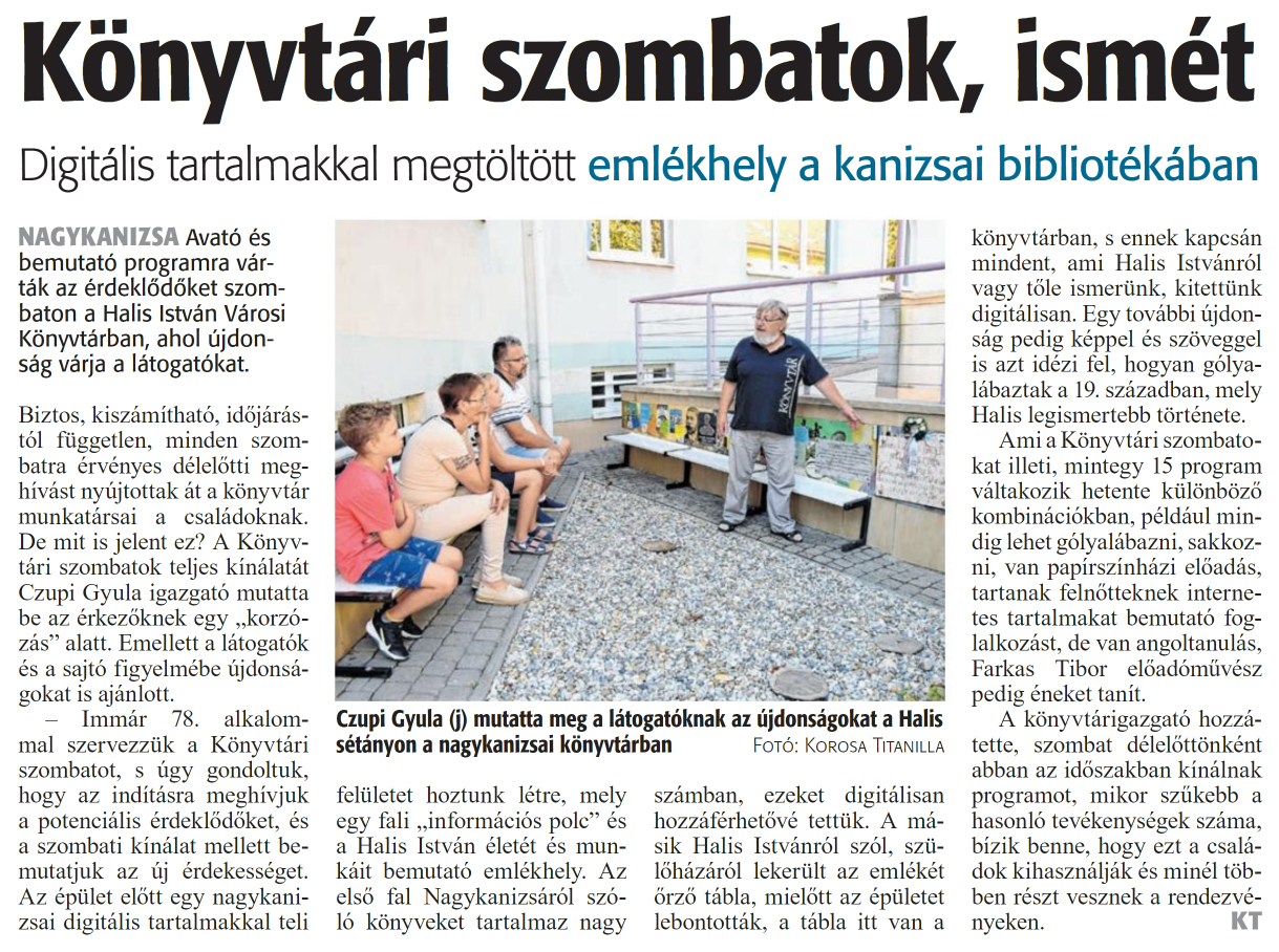 Nyilvános 1009 | 1268 | Zalai Hírlap 2024. szeptember 9. 210. szám 4. oldal | Könyvtári szombatok, ismét Digitális tartalmakkal megtöltött emlékhely a kanizsai bibliotékában NAGYKANIZSA Avató és bemutató programra várták az érdeklődőket szombaton a Halis István Városi Könyvtárban, ahol újdonság várja a látogatókat. Biztos, kiszámítható, időjárástól független, minden szombatra érvényes délelőtti meghívást nyújtottak át a könyvtár munkatársai a családoknak. De mit is jelent ez? A Könyvtári szombatok teljes kínálatát Czupi Gyula igazgató mutatta be az érkezőknek egy „korzózás" alatt. Emellett a látogatók és a sajtó figyelmébe újdonságokat is ajánlott. - Immár 78. alkalommal szervezzük a Könyvtári szombatot, s úgy gondoltuk, hogy az indításra meghívjuk a potenciális érdeklődőket, és a szombati kínálat mellett bemutatjuk az új érdekességet. Az épület előtt egy nagykanizsai digitális tartalmakkal teli felületet hoztunk létre, mely egy fali „információs polc" és a Halis István életét és munkáit bemutató emlékhely. Az első fal Nagykanizsáról szóló könyveket tartalmaz nagy számban, ezeket digitálisan hozzáférhetővé tettük. A másik Halis Istvánról szól, szülőházáról lekerült az emlékét őrző tábla, mielőtt az épületet lebontották, a tábla itt van a könyvtárban, s ennek kapcsán mindent, ami Halis Istvánról vagy tőle ismerünk, kitettünk digitálisan. Egy további újdonság pedig képpel és szöveggel is azt idézi fel, hogyan gólyalábaztak a 19. században, mely Halis legismertebb története. Ami a Könyvtári szombatokat illeti, mintegy 15 program váltakozik hetente különböző kombinációkban, például mindig lehet gólyalábazni, sakkozni, van papírszínházi előadás, tartanak felnőtteknek internetes tartalmakat bemutató foglalkozást, de van angoltanulás, Farkas Tibor előadóművész pedig éneket tanít. A könyvtárigazgató hozzátette, szombat délelőttönként abban az időszakban kínálnak programot, mikor szűkebb a hasonló tevékenységek száma, bízik benne, hogy ezt a családok kihasználják és minél többen részt vesznek a rendezvényeken. KT Czupi Gyula (j) mutatta meg a látogatóknak az újdonságokat a Halis sétányon a nagykanizsai könyvtárban Fotó: Korosa Titanilla |