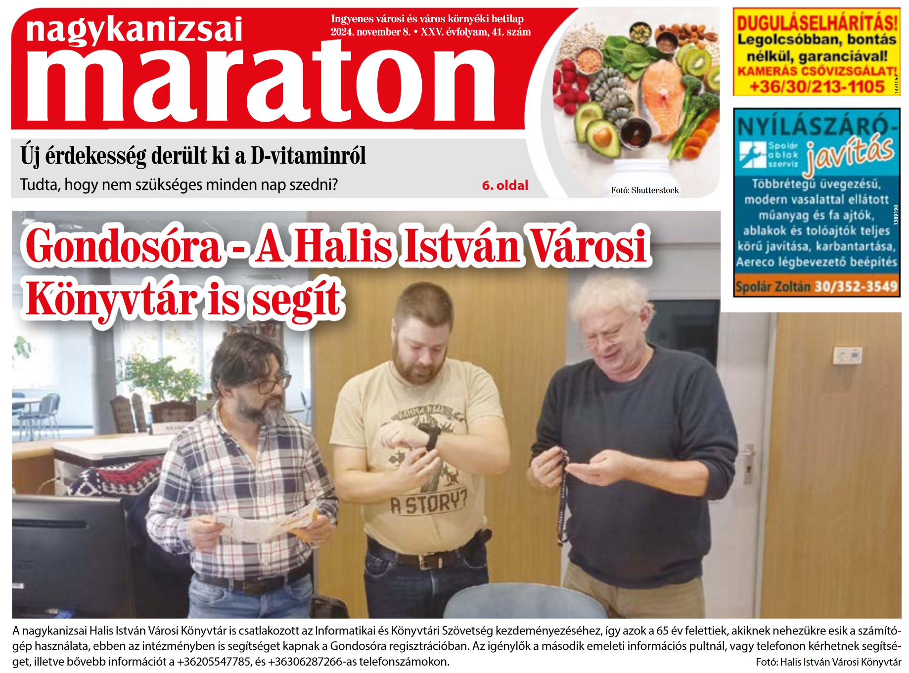 Nyilvános 1002 | 1158 | Nagykanizsai Maraton 2024. november 8. 41. szám 1. oldal | Gondosóra - A Halis István Városi Könyvtár is segít A nagykanizsai Halis István Városi Könyvtár is csatlakozott az Informatikai és Könyvtári Szövetség kezdeményezéséhez, így azok a 65 év felettiek, akiknek nehezükre esik a számítógép használata, ebben az intézményben is segítséget kapnak a Gondosóra regisztrációban. Az igénylők a második emeleti információs pultnál, vagy telefonon kérhetnek segítséget, illetve bővebb információt a +36205547785, és +36306287266-as telefonszámokon. Fotó: Halis István Városi Könyvtár |