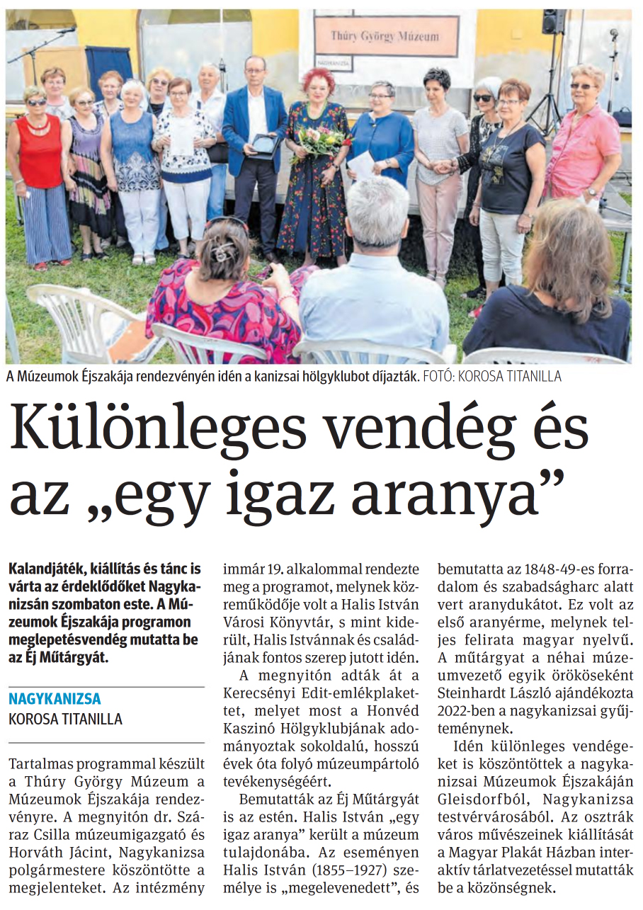 Nyilvános 843 | 1348 | Zalai Hírlap 2025. június 23. 143. szám 3. oldal | Különleges vendég és az „egy igaz aranya" Kalandjáték, kiállítás és tánc is várta az érdeklődőket Nagykanizsán szombaton este. A Múzeumok Éjszakája programon meglepetésvendég mutatta be az Éj Műtárgyát. NAGYKANIZSA KOROSA TITANILLA Tartalmas programmal készült a Thúry György Múzeum a Múzeumok Éjszakája rendezvényre. A megnyitón dr. Száraz Csilla múzeumigazgató és Horváth Jácint, Nagykanizsa polgármestere köszöntötte a megjelenteket. Az intézmény immár 19. alkalommal rendezte meg a programot, melynek közreműködője volt a Halis István Városi Könyvtár, s mint kiderült, Halis Istvánnak és családjának fontos szerep jutott idén. A megnyitón adták át a Kerecsényi Edit-emlékplakettet, melyet most a Honvéd Kaszinó Hölgyklubjának adományoztak sokoldalú, hosszú évek óta folyó múzeumpártoló tevékenységéért. Bemutatták az Éj Műtárgyát is az estén. Halis István „egy igaz aranya" került a múzeum tulajdonába. Az eseményen Halis István (1855-1927) személye is „megelevenedett", és bemutatta az 1848-49-es forradalom és szabadságharc alatt vert aranydukátot. Ez volt az első aranyérme, melynek teljes felirata magyar nyelvű. A műtárgyat a néhai múzeumvezető egyik örököseként Steinhardt László ajándékozta 2022-ben a nagykanizsai gyűjteménynek. Idén különleges vendégeket is köszöntöttek a nagykanizsai Múzeumok Éjszakáján Gleisdorfból, Nagykanizsa testvérvárosából. Az osztrák város művészeinek kiállítását a Magyar Plakát Házban interaktív tárlatvezetéssel mutatták be a közönségnek. A Múzeumok Éjszakája rendezvényén idén a kanizsai hölgyklubot díjazták. FOTÓ: KOROSA TITANILLA |