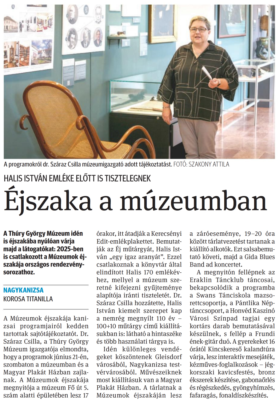 Nyilvános 878 | 1351 | Zalai Hírlap 2025. június 18. 139. szám 3. oldal | HALIS ISTVÁN EMLÉKE ELŐTT IS TISZTELEGNEK Éjszaka a múzeumban A Thúry György Múzeum idén is éjszakába nyúlóan várja majd a látogatókat: 2025-ben is csatlakozott a Múzeumok éjszakája országos rendezvénysorozathoz. NAGYKANIZSA KOROSA TITANILLA A Múzeumok éjszakája kanizsai programjairól kedden tartottak sajtótájékoztatót. Dr. Száraz Csilla, a Thúry György Múzeum igazgatója elmondta, hogy a programok június 21-én, szombaton a múzeumban és a Magyar Plakát Házban zajlanak. A Múzeumok éjszakája megnyitója a múzeum Fő út 5. szám alatti épületében lesz 17 órakor, itt átadják a Kerecsényi Edit-emlékplakettet. Bemutatják az Éj műtárgyát, Halis István „egy igaz aranyát". Ezzel csatlakoznak a könyvtár által elindított Halis 170 emlékévhez, mellyel a múzeum szeretné kifejezni gyűjteménye alapítója iránti tiszteletét. Dr. Száraz Csilla hozzátette, Halis István kiemelt szerepet kap a nemrég megnyílt 110 év -100+10 műtárgy című kiállításukban is: látható a hintaszéke és több használati tárgya is. Idén különleges vendégeket köszöntenek Gleisdorf városából, Nagykanizsa testvérvárosából. Művészeiknek most kiállításuk van a Magyar Plakát Házban. A tárlatnak a Múzeumok éjszakáján lesz a záróeseménye, 19-20 óra között tárlatvezetést tartanak a kiállító alkotók. Ezt salsabemu-tató követi, majd a Gida Blues Band ad koncertet. A megnyitón fellépnek az Eraklin Táncklub táncosai, bekapcsolódik a programba a Swans Tánciskola mazso-rettcsoportja, a Pántlika Néptánccsoport, a Honvéd Kaszinó Városi Színpad tagjai egy kortárs darab bemutatásával készülnek, s fellép a Frundi ének-gitár duó. A gyerekeket 16 órától Kincskereső kalandtúra várja, lesz interaktív mesejáték, kézműves-foglalkozások - jégkorszaki kavicsfestés, bronz ékszerek készítése, gabonaőrlés és régészkedés, gyöngyhímzés, fafaragás, fonaldíszkészítés. A programokról dr. Száraz Csilla múzeumigazgató adott tájékoztatást. FOTÓ: SZAKONY ATTILA |
