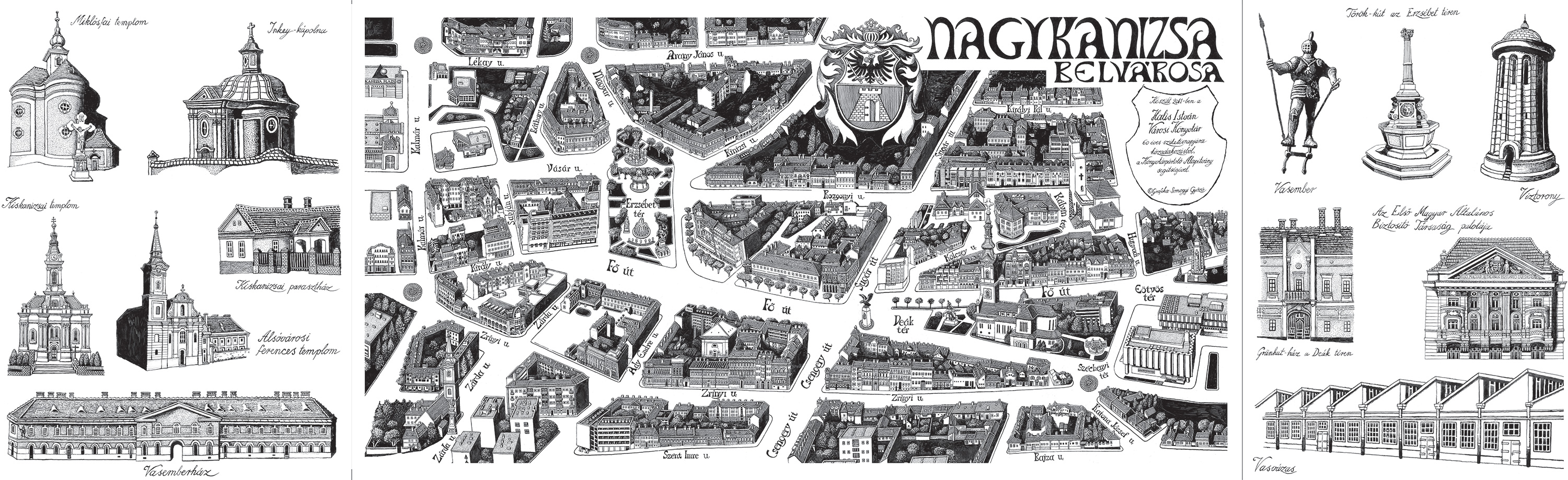Nyilvános 2670 | 10841 | Nagykanizsa belvárosa madártávlati képe - Somogyi Győző alkotása - nagy méretben megtekinthető a könyvtárban, kis méretben meg is vásárolható a könyvtártól: | A 30x100 cm-es Nagykanizsa belvárosa madártávlati kép érvényes olvasói tagsággal rendelkezők számára 200 Ft-ba kerül, egyébként 300 Ft, fóliázott változatban 600 Ft (olvasóinknak 500 Ft). |