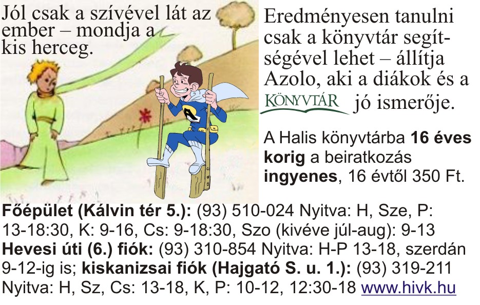 Nyilvános 1184 | 2623 | Jól csak a szívével lát az ember – mondja a kis herceg. | Eredményesen tanulni csak a könyvtár segítségével lehet – állítja Azolo, aki a diákok és a könyvtár jó ismerője. A Halis könyvtárba 16 éves korig a beiratkozás ingyenes, 16 évtől 350 Ft. Főépület (Kálvin tér 5.): (93) 510-024 Nyitva: H, Sze, P: 13-18:30, K: 9-16, Cs: 9-18:30, Szo (kivéve júl-aug): 9-13 Hevesi úti (6.) fiók: (93) 310-854 Nyitva: H-P 13-18, szerdán 9-12-ig is; kiskanizsai fiók (Hajgató S. u. 1.): (93) 319-211 Nyitva: H, Sz, Cs: 13-18, K, P: 10-12, 12:30-18 www.hivk.hu |