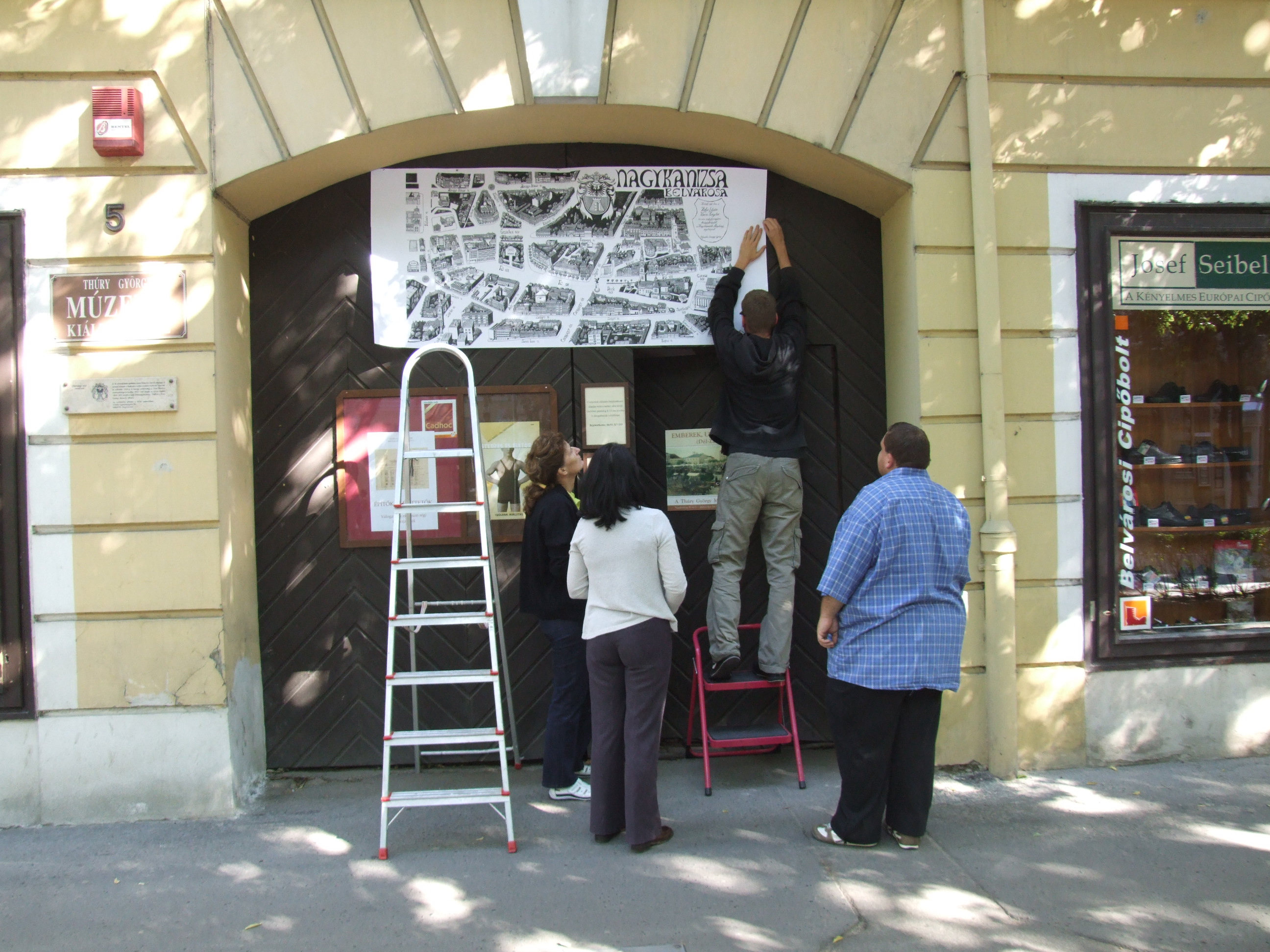 2011.09.23. Madártávlati kép felrakása a Thúry György Múzeum kiállítóhelyének bejárata fölé