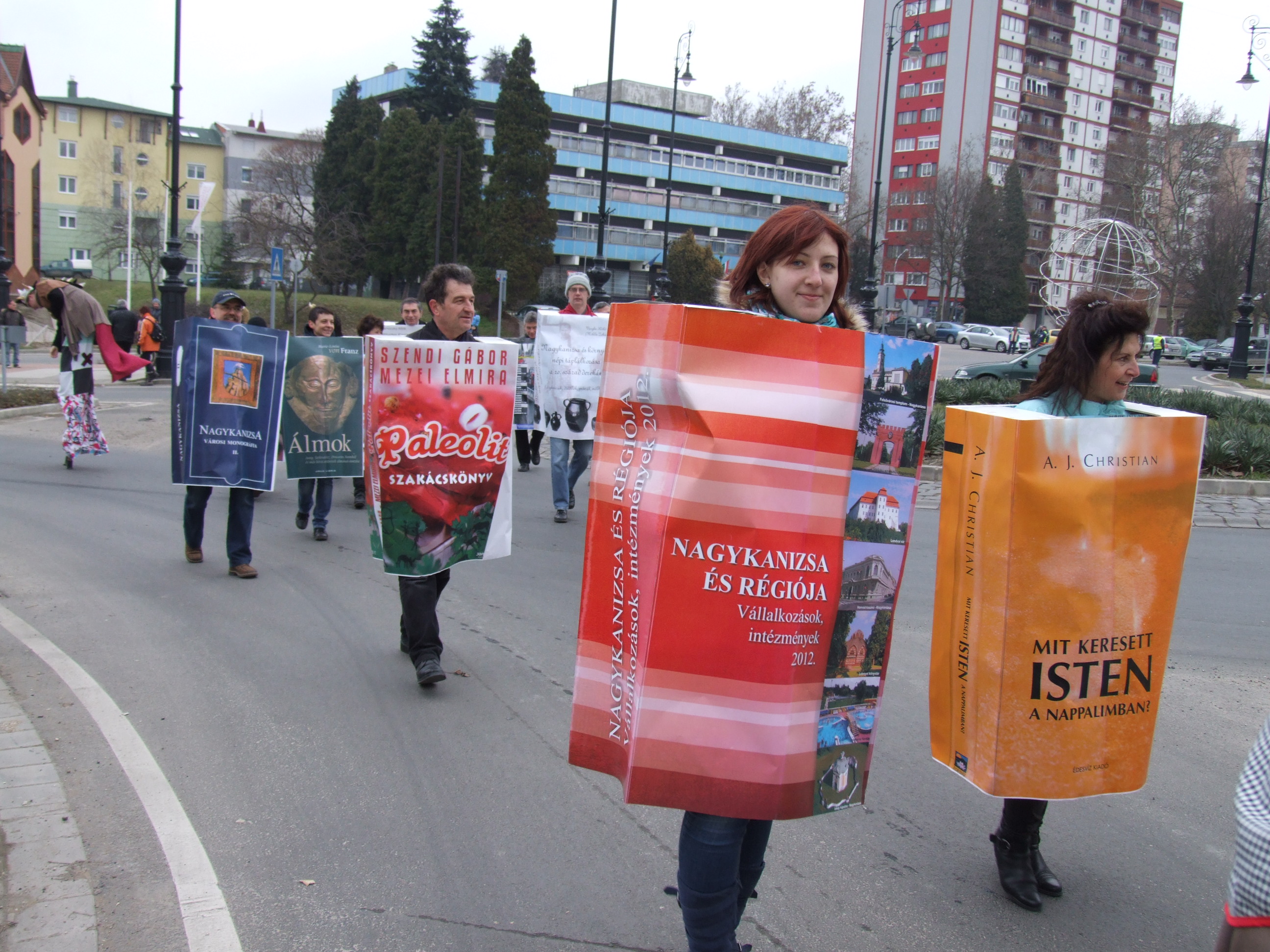 Nyilvános 1103 | 1525 | 2013. február 9. A farsangi fánkfesztiválra készülve felhívásban kértük olvasóinkat, hogy öltsék magukra kedves könyvüket. Egy „könyvespolcnyi” jelentkező vette magára kedves olvasmányát, az ő vonulásukról készültek ezek a képek. A környezetükben néhol láthatók a Nagykanizsai Gólyalábasok, akik szintén a könyvtárhoz kötődnek. A „felvonuló kötetek” a könyvtár épületében még megtekinthetők. | |