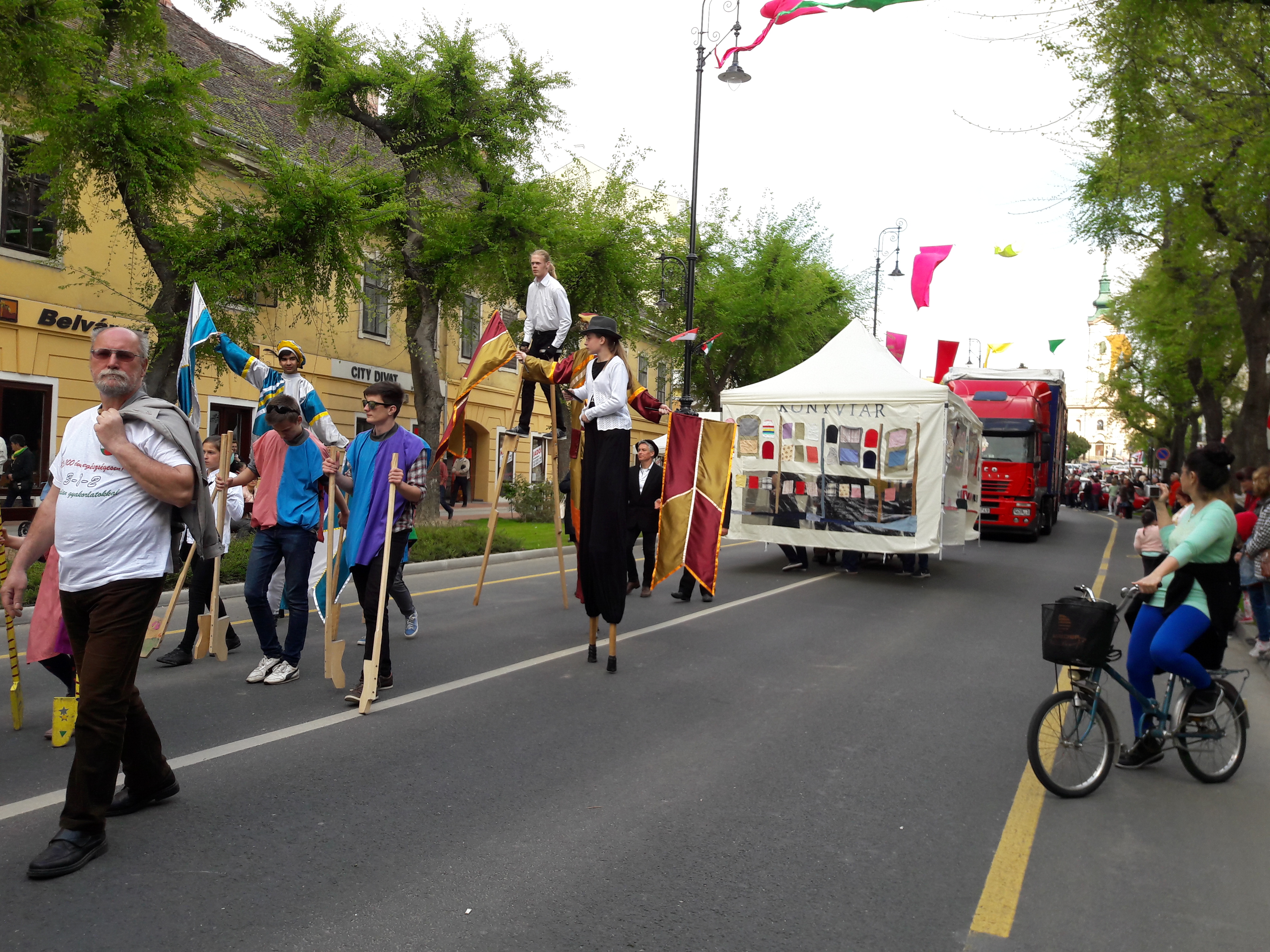 2017.04.30. Utca Tánc Fesztivál - Vonulás - Gólyalábasok, fekete kalapos táncosok, meridián tornások