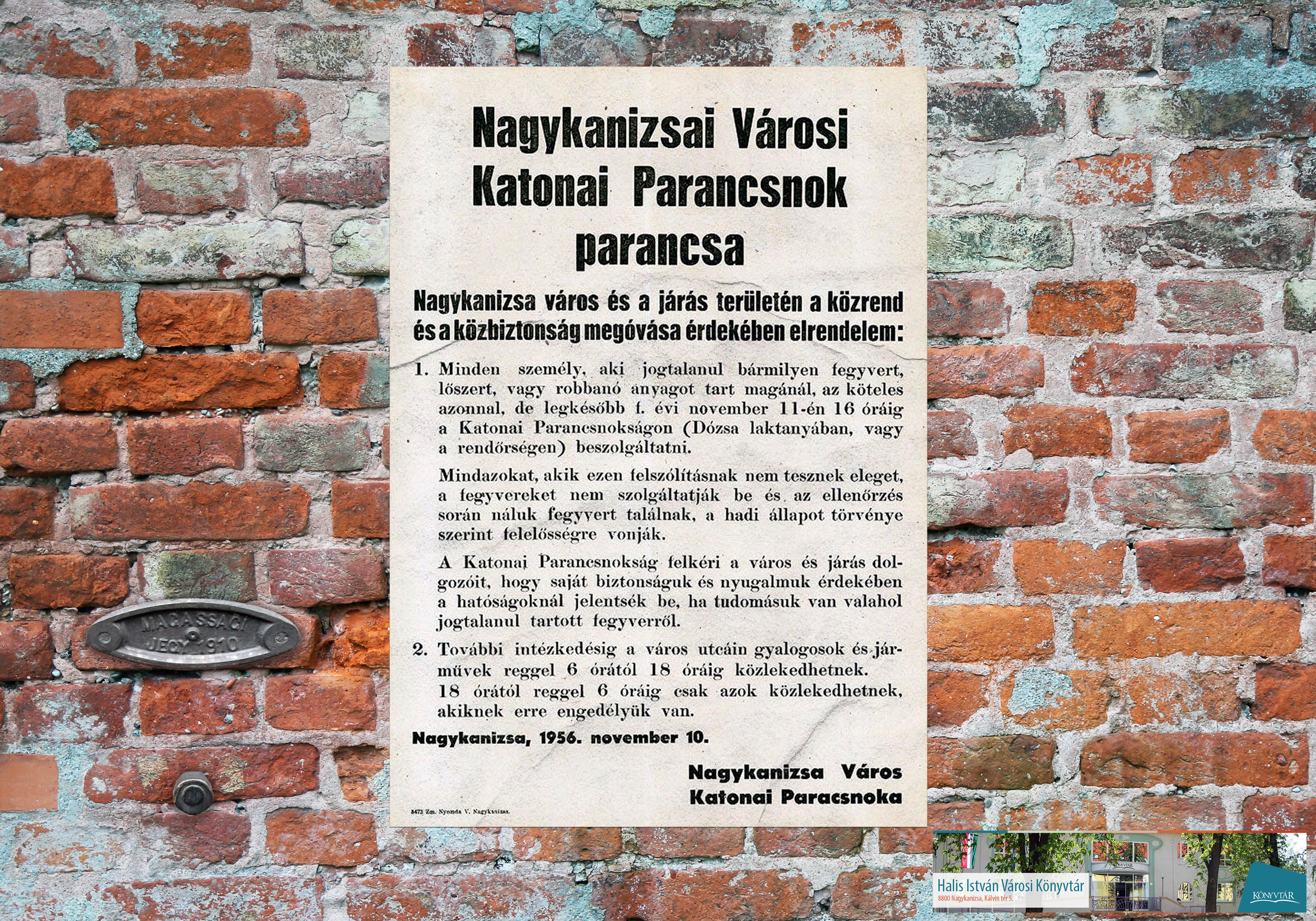 Nyilvános 1394 | 2272 | Az 1956-os forradalom leverése után | Október 23-i kiállításunk képei közül az időrendben következőt mutatjuk be. Az előző két szórólap a forradalmi szervek dokumentuma volt. Most egy falragasz következik, ez azonban már a forradalom leverése után készült. A szovjet csapatok 1956. november 5-én szállták meg Nagykanizsát, november 7-én el is hagyták a várost. A helyi katonai parancsnok ezek után tett közzé ezt az utasítását. Kattintson a képre! |