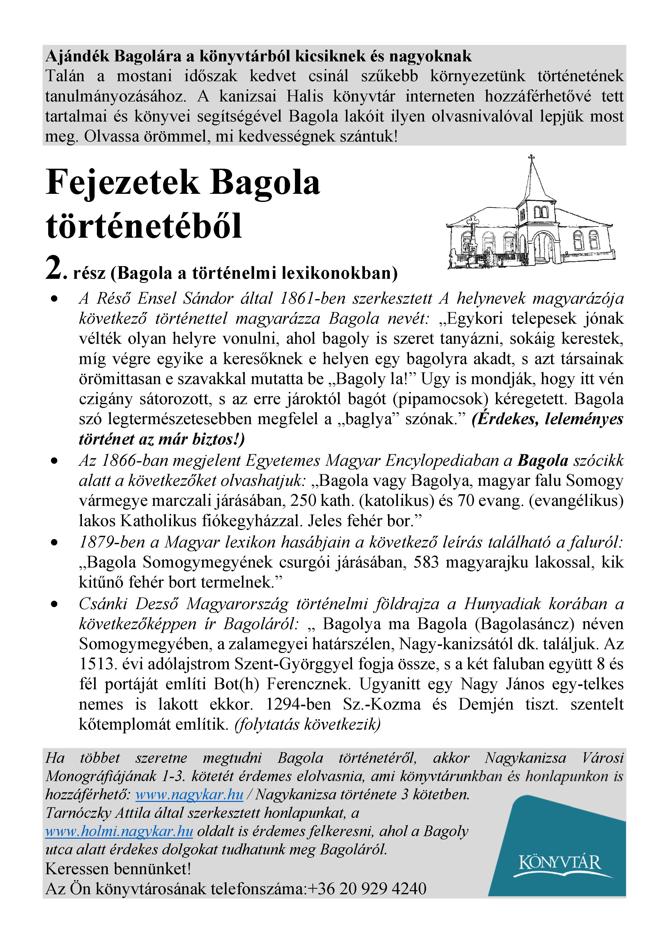 Nyilvános 1752 | 2642 | Rövid leírás | Teljes leírás (2.67 KB) | Megjelenés: 2021. április 9. Ajándék Bagolára a könyvtárból kicsiknek és nagyoknak Talán a mostani időszak kedvet csinál szűkebb környezetünk történetének tanulmányozásához. A kanizsai Halis könyvtár interneten hozzáférhetővé tett tartalmai és könyvei segítségével Bagola lakóit ilyen olvasnivalóval lepjük most meg. Olvassa örömmel, mi kedvességnek szántuk! Fejezetek Bagola történetéből 2. rész (Bagola a történelmi lexikonokban) • A Réső Ensel Sándor által 1861-ben szerkesztett A helynevek magyarázója következő történettel magyarázza Bagola nevét: „Egykori telepesek jónak vélték olyan helyre vonulni, ahol bagoly is szeret tanyázni, sokáig kerestek, míg végre egyike a keresőknek e helyen egy bagolyra akadt, s azt társainak örömittasan e szavakkal mutatta be „Bagoly la!” Ugy is mondják, hogy itt vén czigány sátorozott, s az erre jároktól bagót (pipamocsok) kéregetett. Bagola szó legtermészetesebben megfelel a „baglya” szónak.” (Érdekes, leleményes történet az már biztos!) • Az 1866-ban megjelent Egyetemes Magyar Encylopediaban a Bagola szócikk alatt a következőket olvashatjuk: „Bagola vagy Bagolya, magyar falu Somogy vármegye marczali járásában, 250 kath. (katolikus) és 70 evang. (evangélikus) lakos Katholikus fiókegyházzal. Jeles fehér bor.” • 1879-ben a Magyar lexikon hasábjain a következő leírás található a faluról: „Bagola Somogymegyének csurgói járásában, 583 magyarajku lakossal, kik kitűnő fehér bort termelnek.” • Csánki Dezső Magyarország történelmi földrajza a Hunyadiak korában a következőképpen ír Bagoláról: „ Bagolya ma Bagola (Bagolasáncz) néven Somogymegyében, a zalamegyei határszélen, Nagy-kanizsától dk. találjuk. Az 1513. évi adólajstrom Szent-Györggyel fogja össze, s a két faluban együtt 8 és fél portáját említi Bot(h) Ferencznek. Ugyanitt egy Nagy János egy-telkes nemes is lakott ekkor. 1294-ben Sz.-Kozma és Demjén tiszt. szentelt kőtemplomát említik. (folytatás következik) Ha többet szeretne megtudni Bagola történetéről, akkor Nagykanizsa Városi Monográfiájának 1-3. kötetét érdemes elolvasnia, ami könyvtárunkban és honlapunkon is hozzáférhető: www.nagykar.hu / Nagykanizsa története 3 kötetben. Tarnóczky Attila által szerkesztett honlapunkat, a www.holmi.nagykar.hu oldalt is érdemes felkeresni, ahol a Bagoly utca alatt érdekes dolgokat tudhatunk meg Bagoláról. Keressen bennünket! Az Ön könyvtárosának telefonszáma:+36 20 929 4240 |