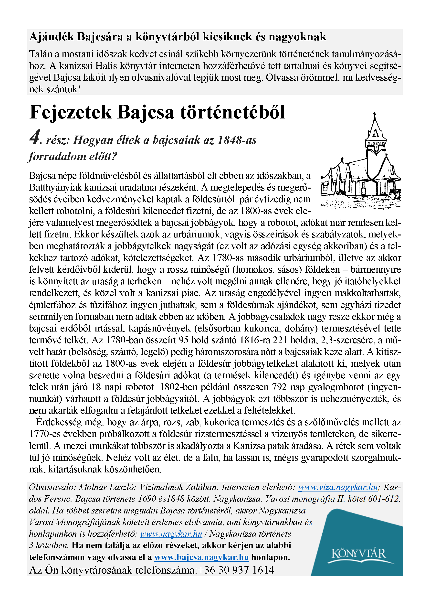 Nyilvános 2000 | 3414 | Megjelenés: 2021. május 7. | Ajándék Bajcsára a könyvtárból kicsiknek és nagyoknak Talán a mostani időszak kedvet csinál szűkebb környezetünk történetének tanulmányozásához. A kanizsai Halis könyvtár interneten hozzáférhetővé tett tartalmai és könyvei segítségével Bajcsa lakóit ilyen olvasnivalóval lepjük most meg. Olvassa örömmel, mi kedvességnek szántuk! Fejezetek Bajcsa történetéből 4. rész: Hogyan éltek a bajcsaiak az 1848-as forradalom előtt? Bajcsa népe földművelésből és állattartásból élt ebben az időszakban, a Batthyányiak kanizsai uradalma részeként. A megtelepedés és megerősödés éveiben kedvezményeket kaptak a földesúrtól, pár évtizedig nem kellett robotolni, a földesúri kilencedet fizetni, de az 1800-as évek elejére valamelyest megerősödtek a bajcsai jobbágyok, hogy a robotot, adókat már rendesen kellett fizetni. Ekkor készültek azok az urbáriumok, vagyis összeírások és szabályzatok, melyekben meghatározták a jobbágytelkek nagyságát (ez volt az adózási egység akkoriban) és a telkekhez tartozó adókat, kötelezettségeket. Az 1780-as második urbáriumból, illetve az akkor felvett kérdőívből kiderül, hogy a rossz minőségű (homokos, sásos) földeken – bármennyire is könnyített az uraság a terheken – nehéz volt megélni annak ellenére, hogy jó itatóhelyekkel rendelkezett, és közel volt a kanizsai piac. Az uraság engedélyével ingyen makkoltathattak, épületfához és tűzifához ingyen juthattak, sem a földesúrnak ajándékot, sem egyházi tizedet semmilyen formában nem adtak ebben az időben. A jobbágycsaládok nagy része ekkor még a bajcsai erdőből irtással, kapásnövények (elsősorban kukorica, dohány) termesztésével tette termővé telkét. Az 1780-ban összeírt 95 hold szántó 1816-ra 221 holdra, 2,3-szeresére, a művelt határ (belsőség, szántó, legelő) pedig háromszorosára nőtt a bajcsaiak keze alatt. A kitisztított földekből az 1800-as évek elején a földesúr jobbágytelkeket alakított ki, melyek után szerette volna beszedni a földesúri adókat (a termések kilencedét) és igénybe venni az egy telek után járó 18 napi robotot. 1802-ben például összesen 792 nap gyalogrobotot (ingyenmunkát) várhatott a földesúr jobbágyaitól. A jobbágyok ezt többször is nehezményezték, és nem akarták elfogadni a felajánlott telkeket ezekkel a feltételekkel. Érdekesség még, hogy az árpa, rozs, zab, kukorica termesztés és a szőlőművelés mellett az 1770-es években próbálkozott a földesúr rizstermesztéssel a vizenyős területeken, de sikertelenül. A mezei munkákat többször is akadályozta a Kanizsa patak áradása. A rétek sem voltak túl jó minőségűek. Nehéz volt az élet, de a falu, ha lassan is, mégis gyarapodott szorgalmuknak, kitartásuknak köszönhetően. Olvasnivaló: Molnár László: Vízimalmok Zalában. Interneten elérhető: www.viza.nagykar.hu; Kardos Ferenc: Bajcsa története 1690 és1848 között. Nagykanizsa. Városi monográfia II. kötet 601-612. oldal. Ha többet szeretne megtudni Bajcsa történetéről, akkor Nagykanizsa Városi Monográfiájának köteteit érdemes elolvasnia, ami könyvtárunkban és honlapunkon is hozzáférhető: www.nagykar.hu / Nagykanizsa története 3 kötetben. Ha nem találja az előző részeket, akkor kérjen az alábbi telefonszámon vagy olvassa el a www.bajcsa.nagykar.hu honlapon. Az Ön könyvtárosának telefonszáma:+36 30 937 1614 |