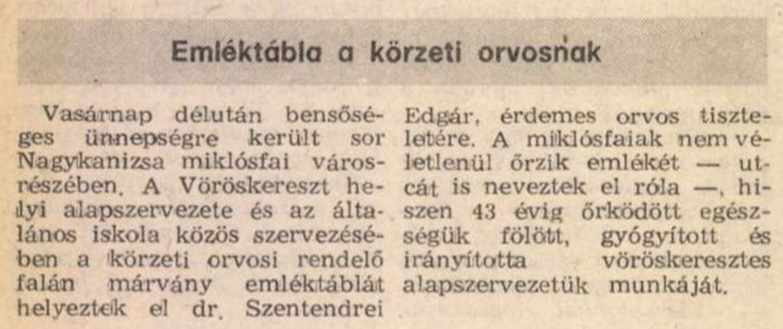 Nyilvános 1251 | 2051 | Zalai Hírlap 1986. május 12. 4. oldal | Emléktábla a körzeti orvosnak Vasárnap délután bensőséges ünnepségre került sor Nagykanizsa miklósfai városrészében. A Vöröskereszt helyi alapszervezete és az általános iskola közös szervezésében a körzeti orvosi rendelő falán márvány emléktáblát helyeztek el dr. Szentendrei Edgár, érdemes orvos tiszteletére. A miklósfaiak nem véletlenül őrzik emlékét — utcát is neveztek el róla —, hiszen 43 évig őrködött egészségük fölött, gyógyított és irányította vöröskeresztes alapszervezetük munkáját. |