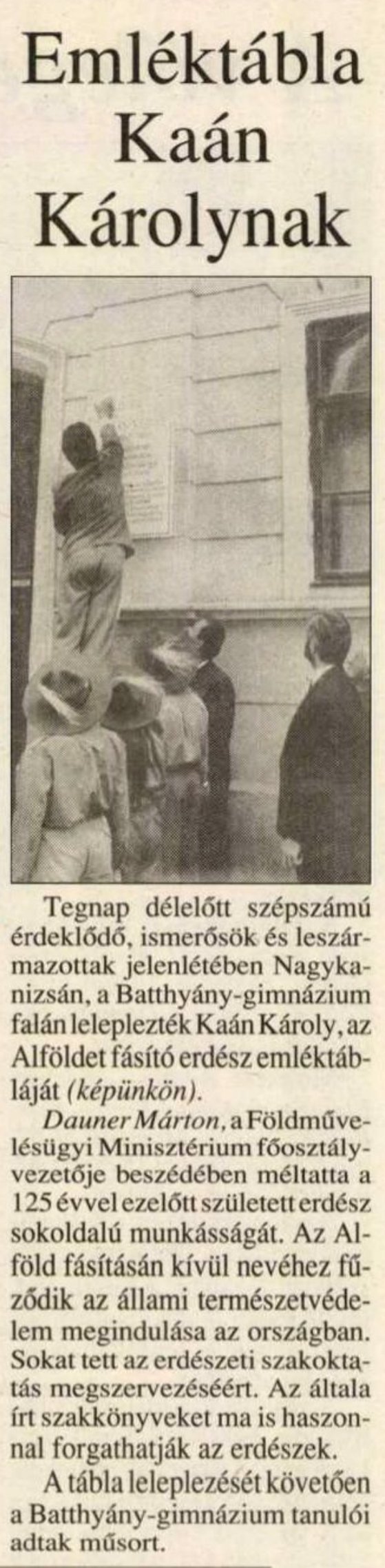 Nyilvános 1244 | 1952 | Zalai Hírlap 1992. május 23. 16. oldal | Emléktábla Kaán Károlynak Tegnap délelőtt szépszámú érdeklődő, ismerősök és leszármazottak jelenlétében Nagykanizsán, a Batthyány-gimnázium falán leleplezték Kaán Károly, az Alföldet fásító erdész emléktábláját (képünkön). Dauner Márton, a Földművelésügyi Minisztérium főosztályvezetője beszédében méltatta a 125 évvel ezelőtt született erdész sokoldalú munkásságát. Az Alföld fásításán kívül nevéhez fűződik az állami természetvédelem megindulása az országban. Sokat tett az erdészeti szakoktatás megszervezéséért. Az általa írt szakkönyveket ma is haszonnal forgathatják az erdészek. A tábla leleplezését követően a Batthyány-gimnázium tanulói adtak műsort. |