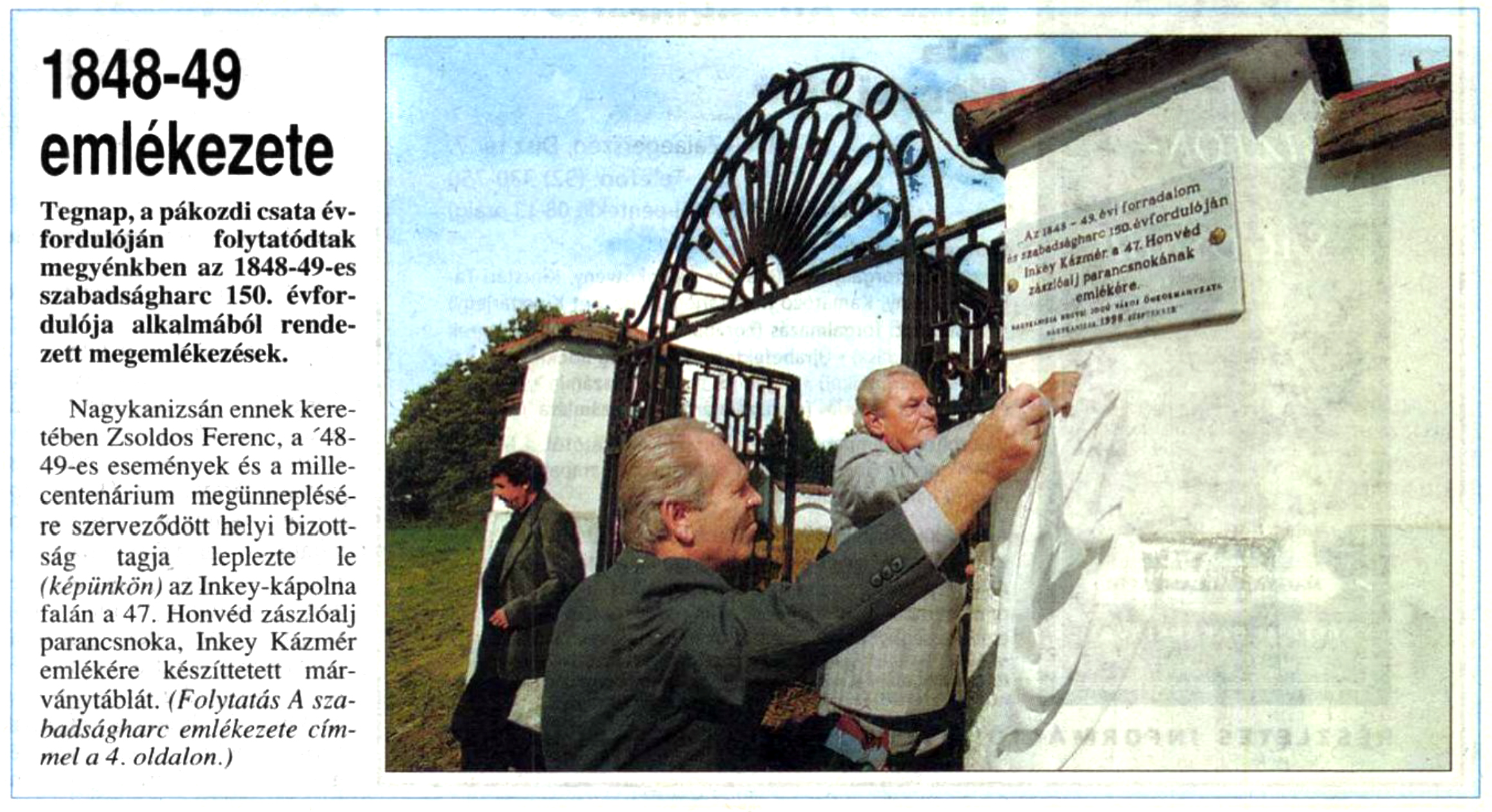 Nyilvános 1288 | 1961 | Rövid leírás | Teljes leírás (642 B) | Zalai Hírlap 1998. szeptember 30. 229. szám 1. oldal 1848-49 emlékezete Tegnap, a pákozdi csata évfordulóján folytatódtak megyénkben az 1848-49-es szabadságharc 150. évfordulója alkalmából rendezett megemlékezések. Nagykanizsán ennek keretében Zsoldos Ferenc, a ''48- 49-es események és a millecentenárium megünneplésére szerveződött helyi bizottság tagja leplezte le (képünkön) az Inkey-kápolna falán a 47. Honvéd zászlóalj parancsnoka, Inkey Kázmér emlékére készíttetett márványtáblát. (Folytatás A szabadságharc emlékezete címmel a 4. oldalon.) |