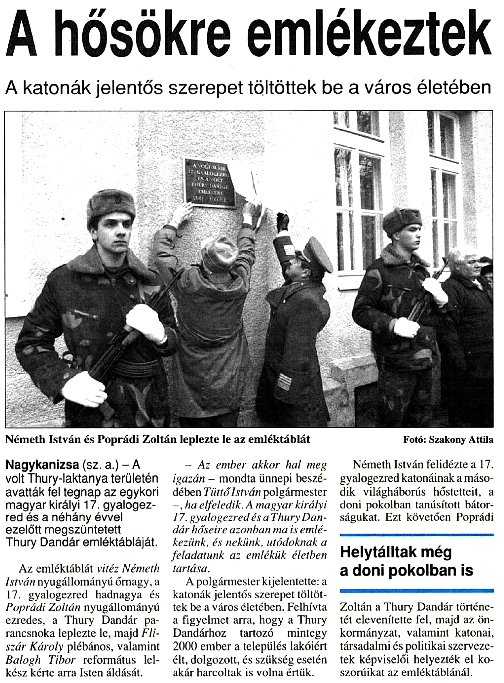 Nyilvános 1178 | 1645 | Zalai Hírlap 2001. november 13. 5. oldal | A hősökre emlékeztek A katonák jelentős szerepet töltöttek be a város életében Németh István és Poprádi Zoltán leplezte le az emléktáblát Fotó: Szakony Attila Nagykanizsa (sz. a.) - A volt Thury-laktanya területén avatták fel tegnap az egykori magyar királyi 17. gyalogezred és a néhány évvel ezelőtt megszüntetett Thury Dandár emléktábláját. Az emléktáblát vitéz Németh István nyugállományú őrnagy, a 17. gyalogezred hadnagya és Poprádi Zoltán nyugállományú ezredes, a Thury Dandár parancsnoka leplezte le, majd Fiiszár Károly plébános, valamint Balogh Tibor református lelkész kérte arra Isten áldását. - Az ember akkor hal meg igazán - mondta ünnepi beszédében Tüttő István polgármester -, ha elfeledik. A magyar királyi 17. gyalogezred és a Thury Dandár hőseire azonban ma is emlékezünk, és nekünk, utódoknak a feladatunk az emlékük életben tartása. A polgármester kijelentette: a katonák jelentős szerepet töltöttek be a város életében. Felhívta a figyelmet arra, hogy a Thury Dandárhoz tartozó mintegy 2000 ember a település lakóiért élt, dolgozott, és szükség esetén akár harcoltak is volna értük. Németh István felidézte a 17. gyalogezred katonáinak a második világháborús hőstetteit, a doni pokolban tanúsított bátorságukat. Ezt követően Poprádi Zoltán a Thury Dandár történetét elevenítette fel, majd az önkormányzat, valamint katonai, társadalmi és politikai szervezetek képviselői helyezték el koszorúikat az emléktáblánál. |