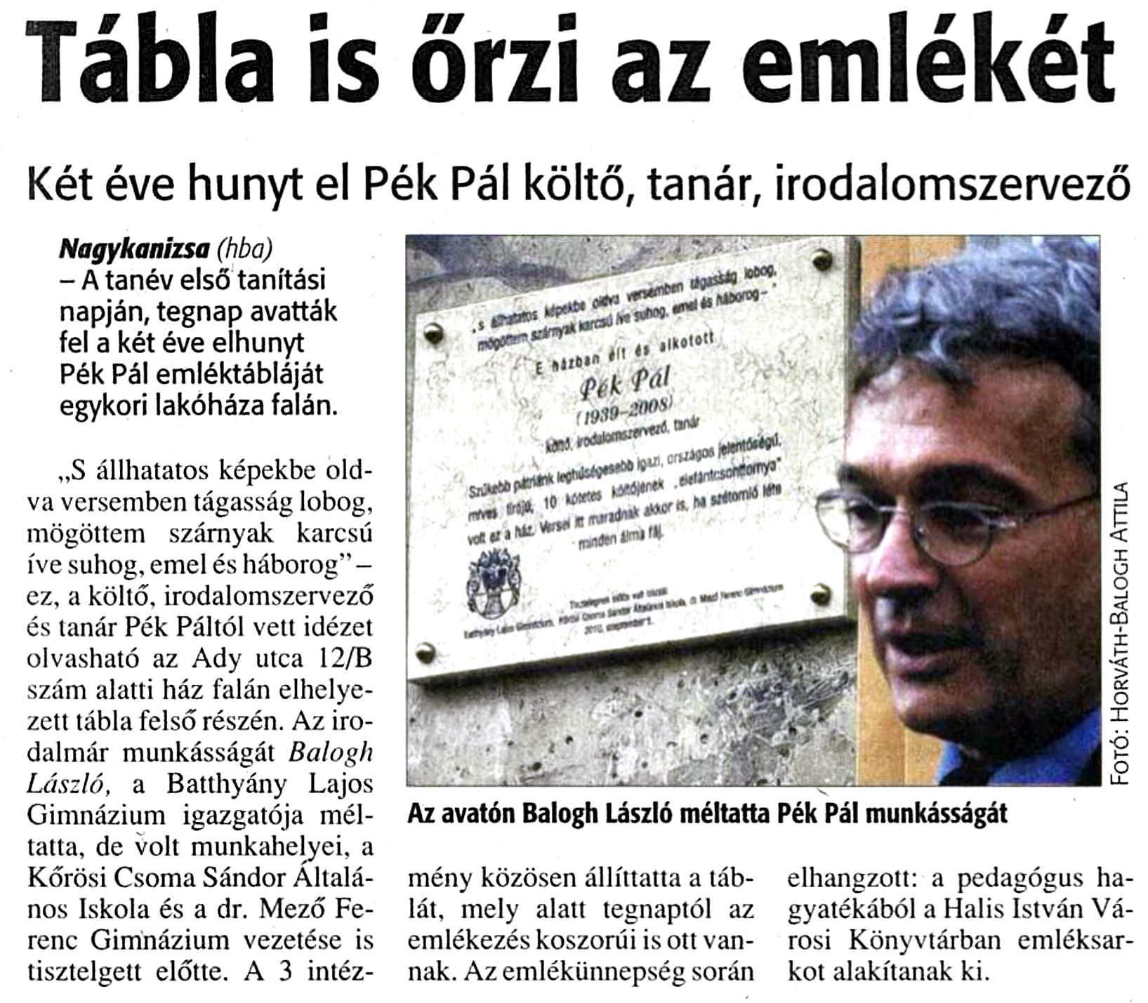 Nyilvános 953 | 1206 | Zalai Hírlap 2010. szeptember 2. 4. oldal | Tábla is őrzi az emlékét Két éve hunyt el Pék Pál költő, tanár, irodalomszervező Nagykanizsa (hba) - A tanév első tanítási napján, tegnap avatták fel a két éve elhunyt Pék Pál emléktábláját egykori lakóháza falán. „S állhatatos képekbe oldva versemben tágasság lobog, mögöttem szárnyak karcsú íve suhog, emel és háborog” - ez, a költő, irodalomszervező és tanár Pék Páltól vett idézet olvasható az Ady utca 12/B szám alatti ház falán elhelyezett tábla felső részén. Az irodalmár munkásságát Balogh László, a Batthyány Lajos Gimnázium igazgatója méltatta, de volt munkahelyei, a Körösi Csorna Sándor Általános Iskola és a dr. Mező Ferenc Gimnázium vezetése is tisztelgett előtte. A 3 intézmény közösen állíttatta a táblát, mely alatt tegnaptól az emlékezés koszorúi is ott vannak. Az emlékünnepség során elhangzott: a pedagógus hagyatékából a Halis István Városi Könyvtárban emléksarkot alakítanak ki. |