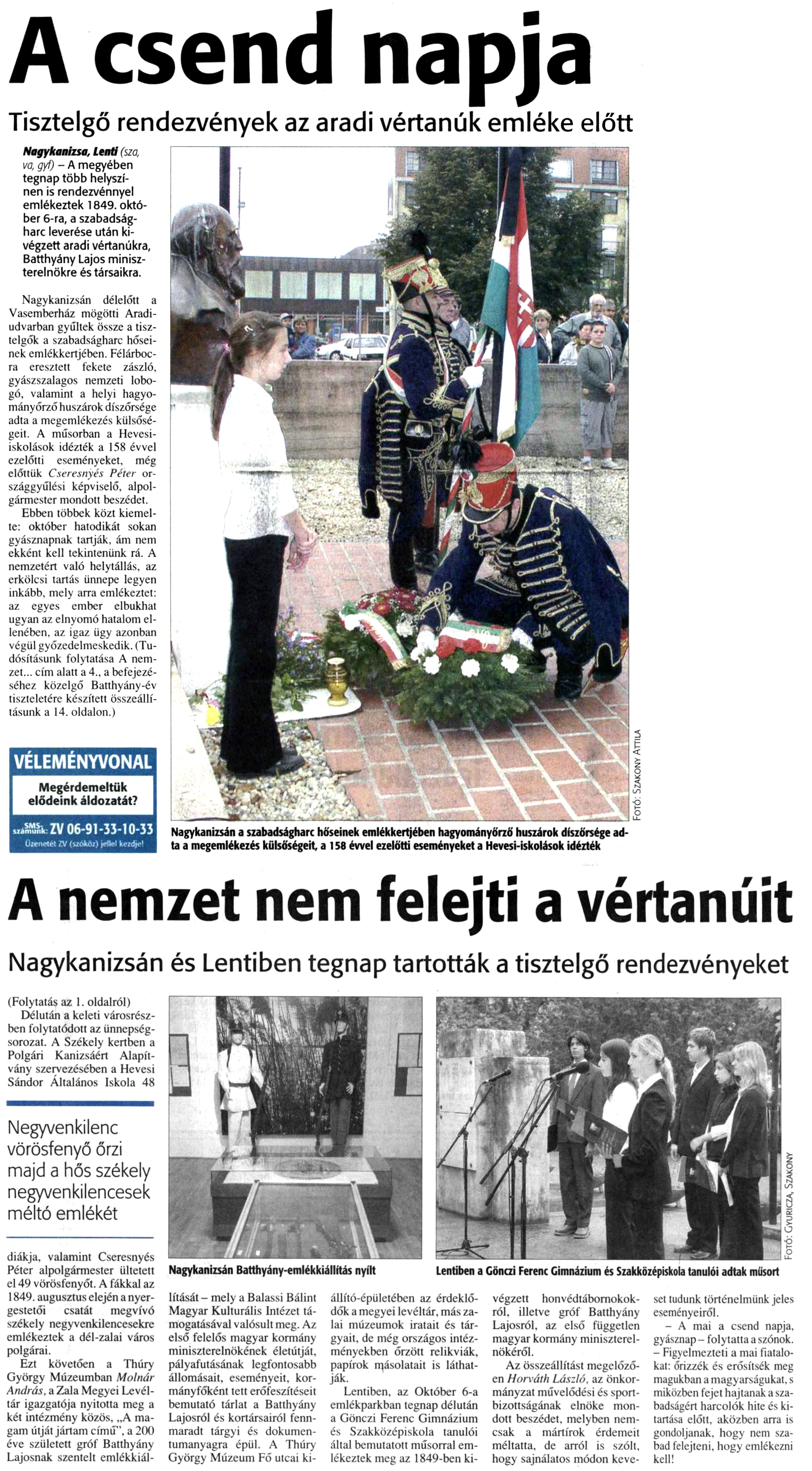 Nyilvános 822 | 1068 | Zalai Hírlap 2007. október 6. 1, 4. oldal | A csend napja Tisztelgő rendezvények az aradi vértanúk emléke előtt Nagykanizsa, Lenti (sza, va, gyf) - A megyében tegnap több helyszínen is rendezvénnyel emlékeztek 1849. október 6-ra, a szabadságharc leverése után kivégzett aradi vértanúkra, Batthyány Lajos miniszterelnökre és társaikra. Nagykanizsán délelőtt a Vasemberház mögötti Aradiudvarban gyűltek össze a tisztelgők a szabadságharc hőseinek emlékkertjében. Félárbocra eresztett fekete zászló, gyászszalagos nemzeti lobogó, valamint a helyi hagyományőrző huszárok díszőrsége adta a megemlékezés külsőségeit. A műsorban a Hevesiiskolások idézték a 158 évvel ezelőtti eseményeket, még előttük Cseresnyés Péter országgyűlési képviselő, alpolgármester mondott beszédet. Ebben többek közt kiemelte: október hatodikét sokan gyásznapnak tartják, ám nem ekként kell tekintenünk rá. A nemzetért való helytállás, az erkölcsi tartás ünnepe legyen inkább, mely arra emlékeztet: az egyes ember elbukhat ugyan az elnyomó hatalom ellenében, az igaz ügy azonban végül győzedelmeskedik. (Tudósításunk folytatása A nemzet... cím alatt a 4., a befejezéséhez közelgő Batthyány-év tiszteletére készített összeállításunk a 14. oldalon.) A nemzet nem felejti a vértanúit Nagykanizsán és Lentiben tegnap tartották a tisztelgő rendezvényeket (Folytatás az 1. oldalról) Délután a keleti városrészben folytatódott az ünnepség-sorozat. A Székely kertben a Polgári Kanizsáért Alapítvány szervezésében a Hevesi Sándor Általános Iskola 48 diákja, valamint Cseresnyés Péter alpolgármester ültetett el 49 vörösfenyőt. A fákkal az 1849. augusztus elején a nyergestetői csatát megvívó székely negyvenkilencesekre emlékeztek a dél-zalai város polgárai. Ezt követően a Thúry György Múzeumban Molnár András, a Zala Megyei Levéltár igazgatója nyitotta meg a két intézmény közös, „A magam útját jártam című”, a 200 éve született gróf Batthyány Lajosnak szentelt emlékkiállítását - mely a Balassi Bálint Magyar Kulturális Intézet támogatásával valósult meg. Az első felelős magyar kormány miniszterelnökének életútját, pályafutásának legfontosabb állomásait, eseményeit, kormányfőként tett erőfeszítéseit bemutató tárlat a Batthyány Lajosról és kortársairól fennmaradt tárgyi és dokumentumanyagra épül. A Thúry György Múzeum Fő utcai kiállító- épületében az érdeklődők a megyei levéltár, más zalai múzeumok iratait és tárgyait, de még országos intézményekben őrzött relikviák, papírok másolatait is láthatják. Lentiben, az Október 6-a emlékparkban tegnap délután a Gönczi Ferenc Gimnázium és Szakközépiskola tanulói által bemutatott műsorral emlékeztek meg az 1849-ben kivégzett honvédtábornokokról, illetve gróf Batthyány Lajosról, az első független magyar kormány miniszterelnökéről. Az összeállítást megelőzően Horváth László, az önkormányzat művelődési és sportbizottságának elnöke mondott beszédet, melyben nemcsak a mártírok érdemeit méltatta, de arról is szólt, hogy sajnálatos módon keveset tudunk történelmünk jeles eseményeiről. - A mai a csend napja, gyásznap - folytatta a szónok. - Figyelmezteti a mai fiatalokat: őrizzék és erősítsék meg magukban a magyarságukat, s miközben fejet hajtanak a szabadságért harcolók hite és kitartása előtt, aközben arra is gondoljanak, hogy nem szabad felejteni, hogy emlékezni kell! Nagykanizsán Batthyány-emlékkiállítás nyílt Lentiben a Gönczi Ferenc Gimnázium és Szakközépiskola tanulói adtak műsort |